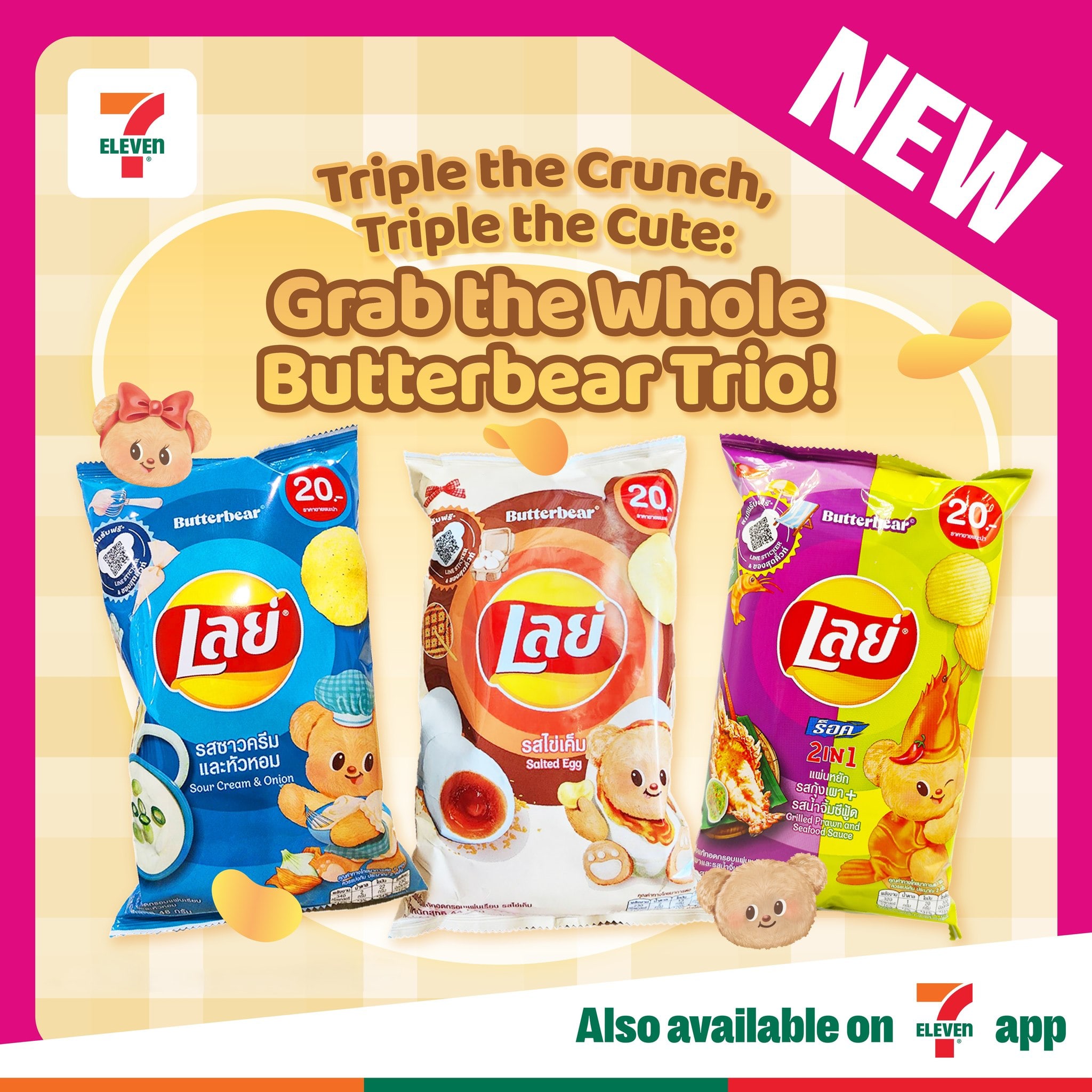 现在不用飞曼谷,新加坡7-Eleven已经正式上架Lay's x Butterbear限定联名薯片。共推出3种口味:咸蛋黄、经典洋葱奶油,还有很有泰式灵魂的虾酱风味。外表可爱,口味却走重口路线,完全是小熊界的甜辣人设。