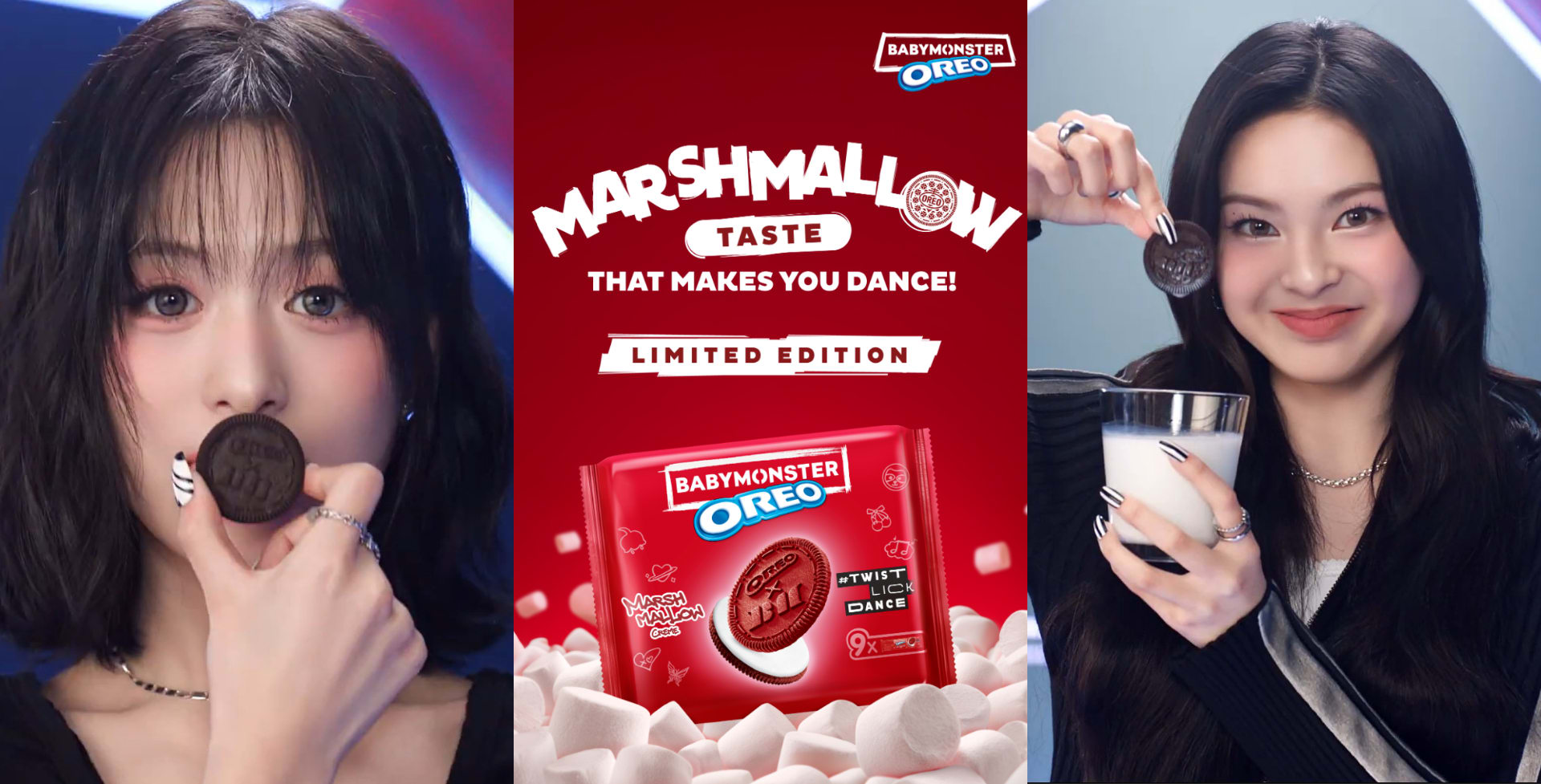 家喻户晓的Oreo和怪物新人女团Babymonster惊喜联名,棉花糖口味的夹心饼干本地限量发售!