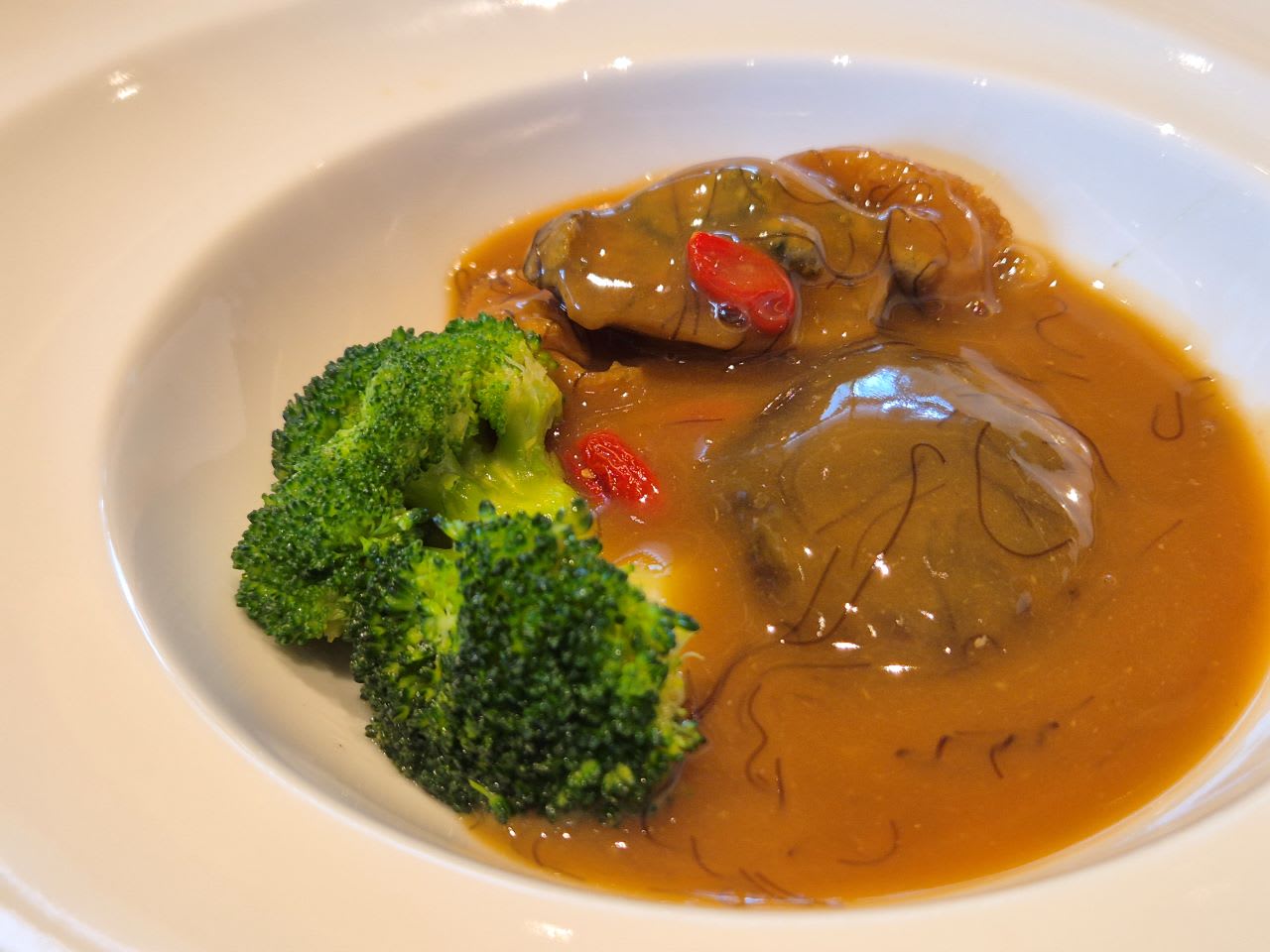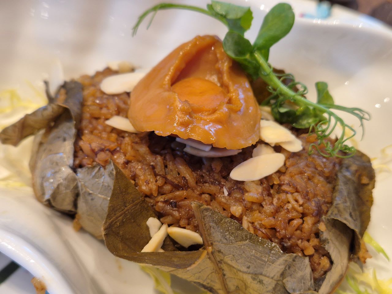鲍鱼搭配荷叶腊味饭,相当新鲜的组合。融合香菇丁、腊味的饭粒飘散着淡淡荷叶香,撒上的杏仁碎片增添口感,整体咸香得宜,却不粘腻重口味。