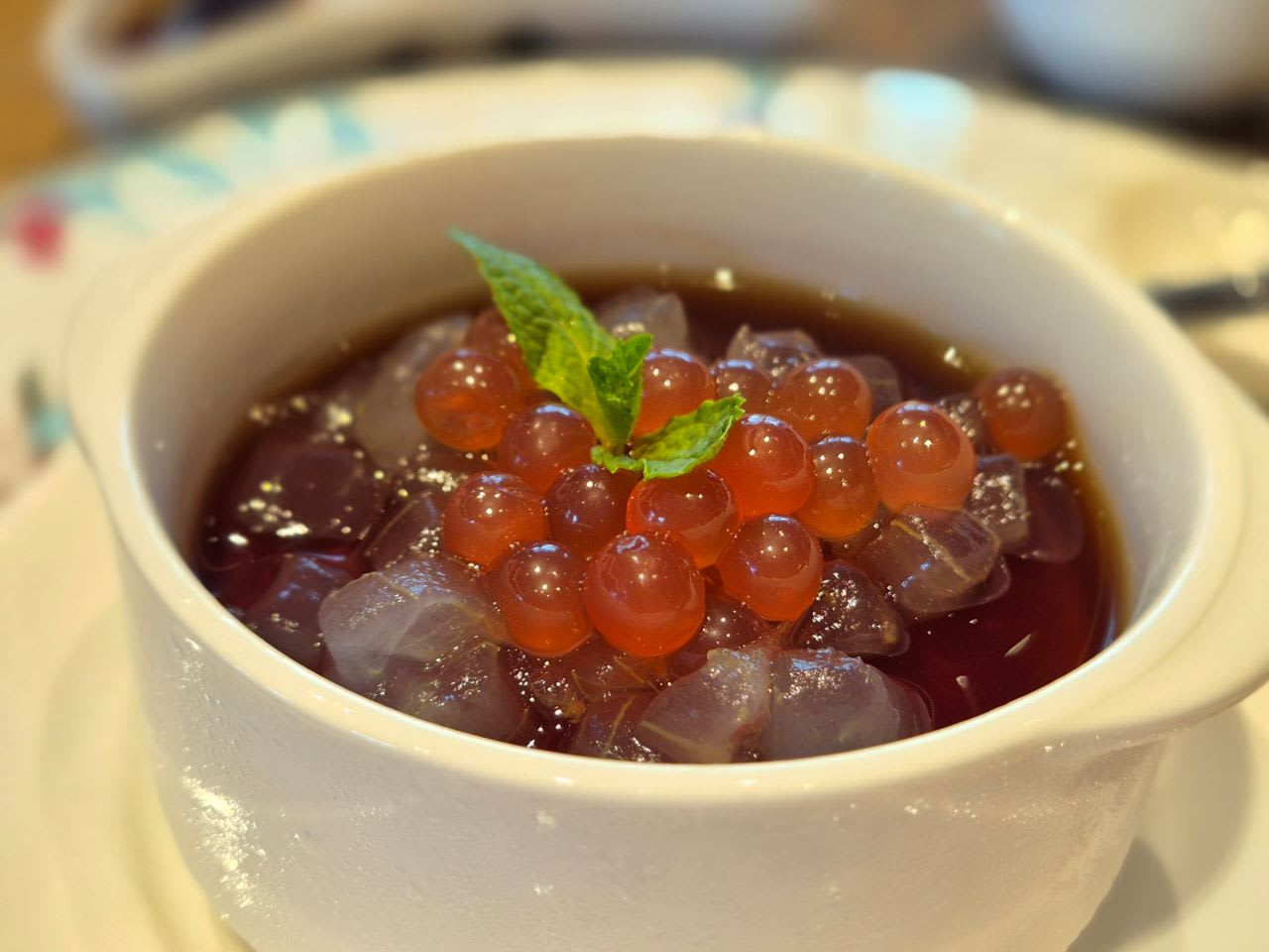 这道甜品沁甜清新的味道和“触感”,为一顿宴席消除油腻感。芦荟、草莓口味的珍珠,融合桂花茶冻,舒缓了一顿大餐后的味觉体验。