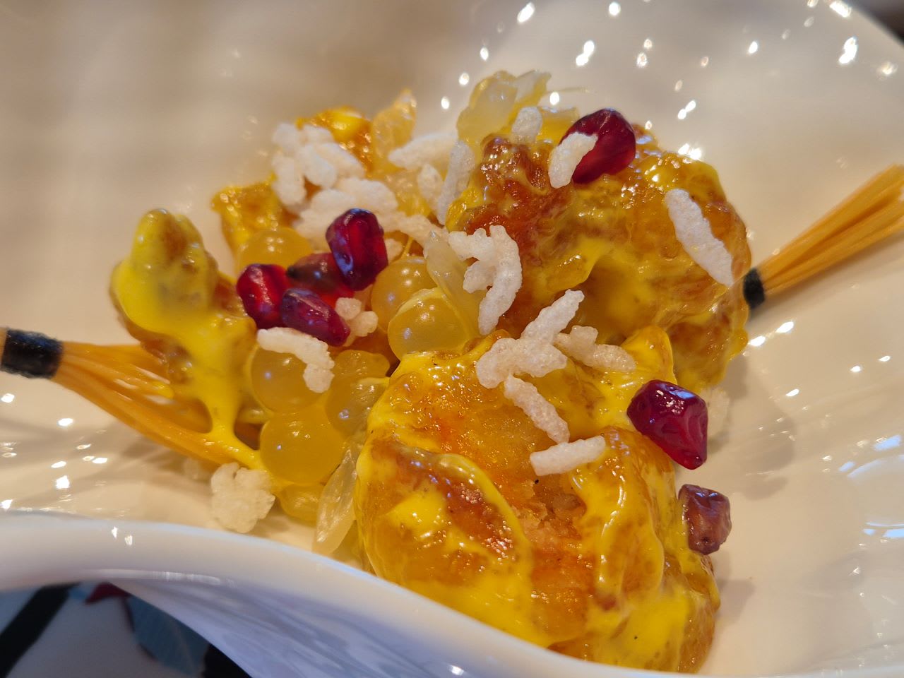 这道人气菜式深获大家的青睐!爽脆口感的炸虾球,沾满特制芒果美乃滋,撒上的“点缀担当”,包括一咬破能尝到“芒果汁”的珍珠以及石榴,更是锦上添花,在口腔的小世界里形成美妙的口感。