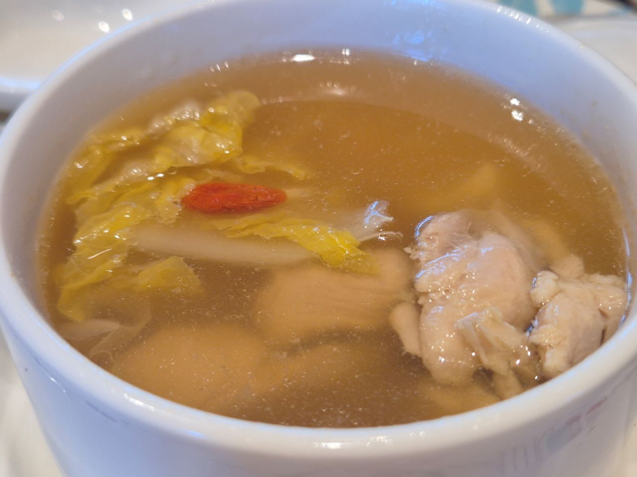 清澈鲜甜的炖鸡汤醇厚暖胃,大白菜、肉质都能保持鲜嫩感,也能尝到瑶柱(干贝)厚实的口感,简单中却能将美味留存在喉间。