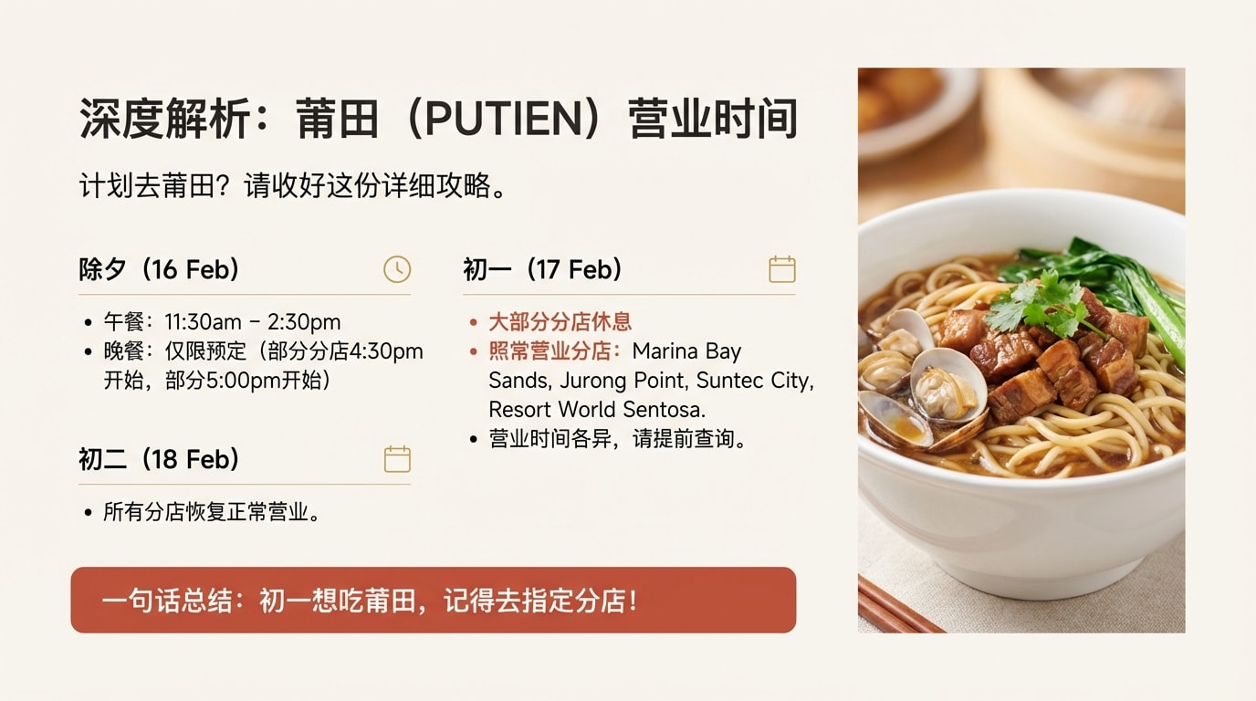 到了大年初一,虽然不少商场略显冷清,但仍有许多“美食灯塔”依然亮着。莆田(PUTIEN)虽然大部分分店在初一休息,但其位于滨海湾金沙、Jurong Point、Suntec City和圣淘沙名胜世界的分店会坚持营业,满足食客的需求。