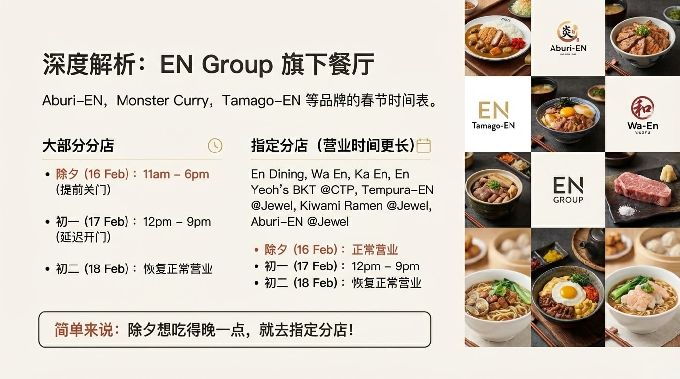 EN Group旗下的品牌如Aburi-EN、Monster Curry等,除了特定分店照常营业外,大部分分店也会在初一的12pm至9pm之间开放。