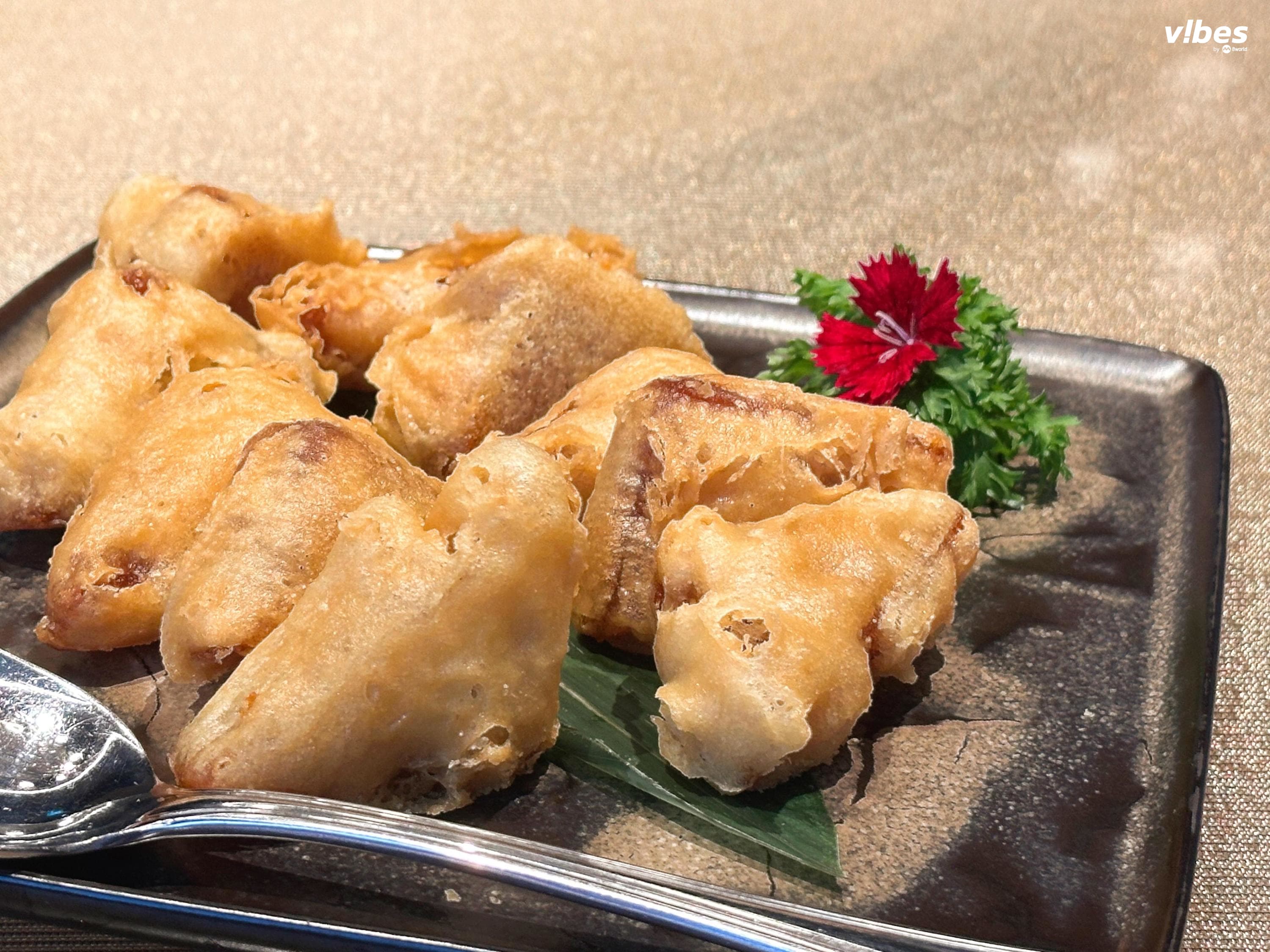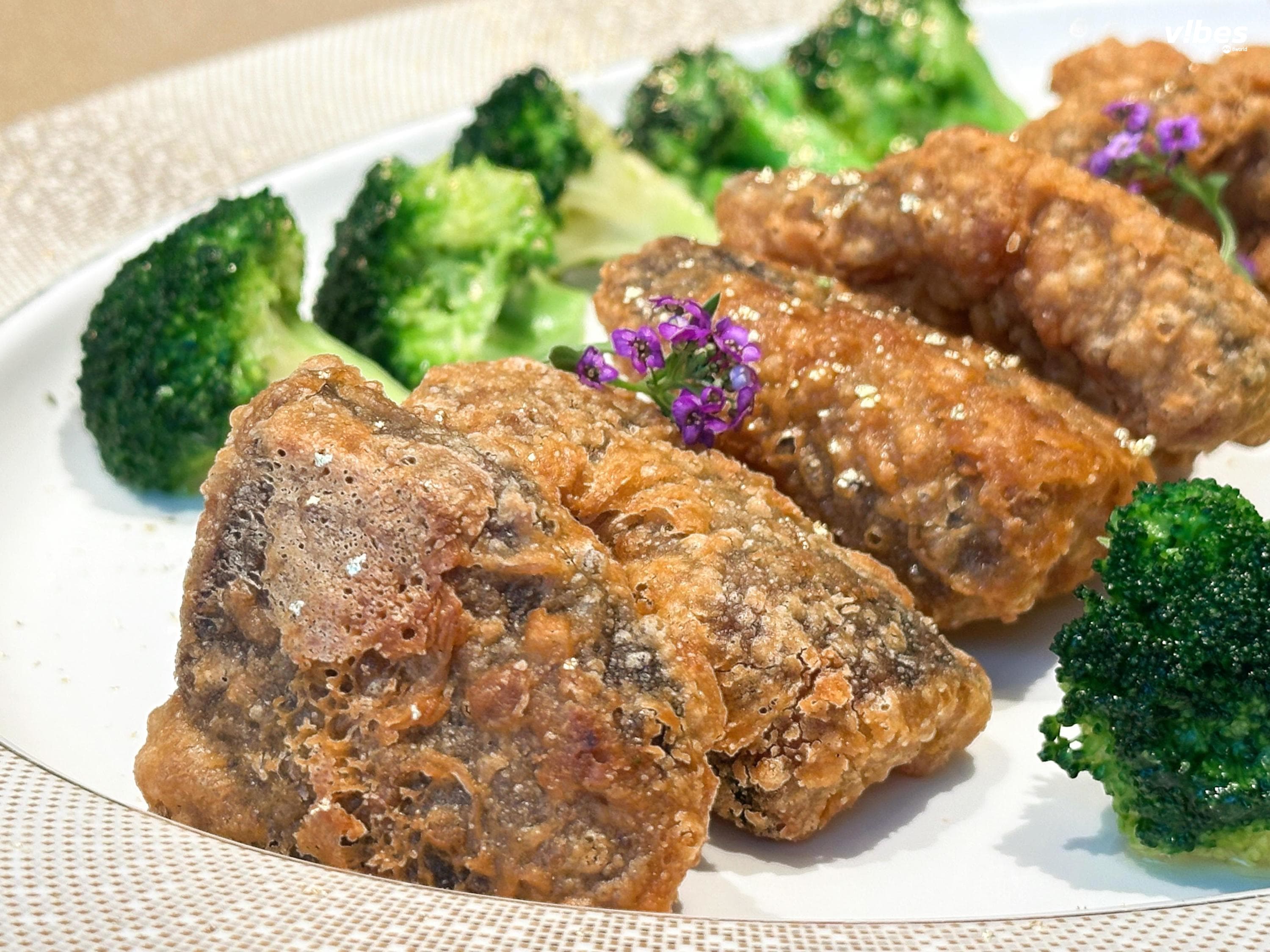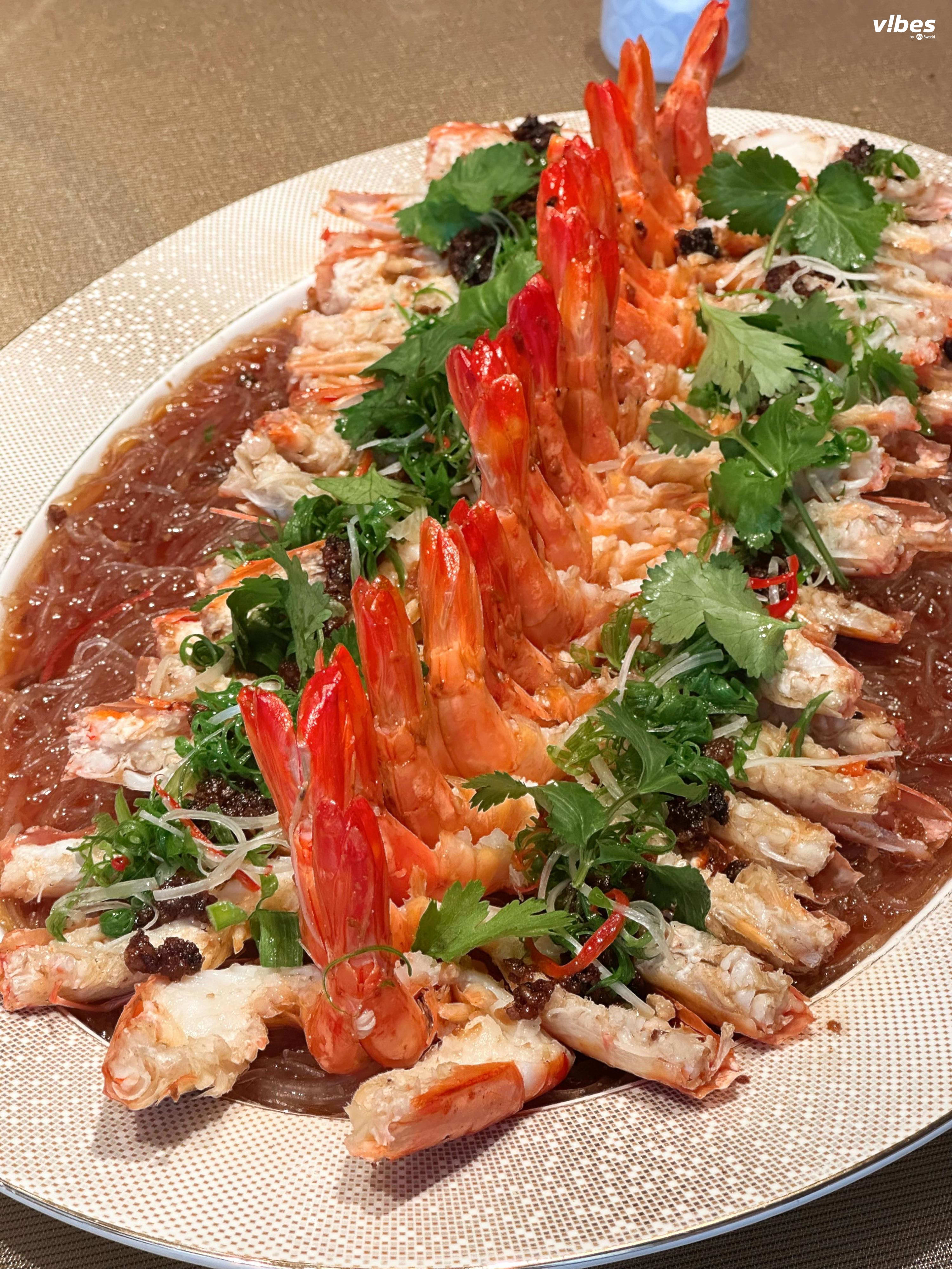 紧随其后的脆炸猪婆参扒西兰花(Crispy Sea Cucumber with Braised Broccoli in Oyster Sauce),将海参以酥炸方式处理,外皮香脆、内里弹糯,口感类似炸年糕,配以蚝油烩西兰花,呈现鲜味与口感的双重层次。三蒜粉丝蒸生虾(Steamed Prawn with Trio Garlic & Vermicelli)也是试菜当天非常受欢迎的年菜,以蒜香托衬虾鲜,底层粉丝饱吸虾汁与蒜蓉精华,令人回味。