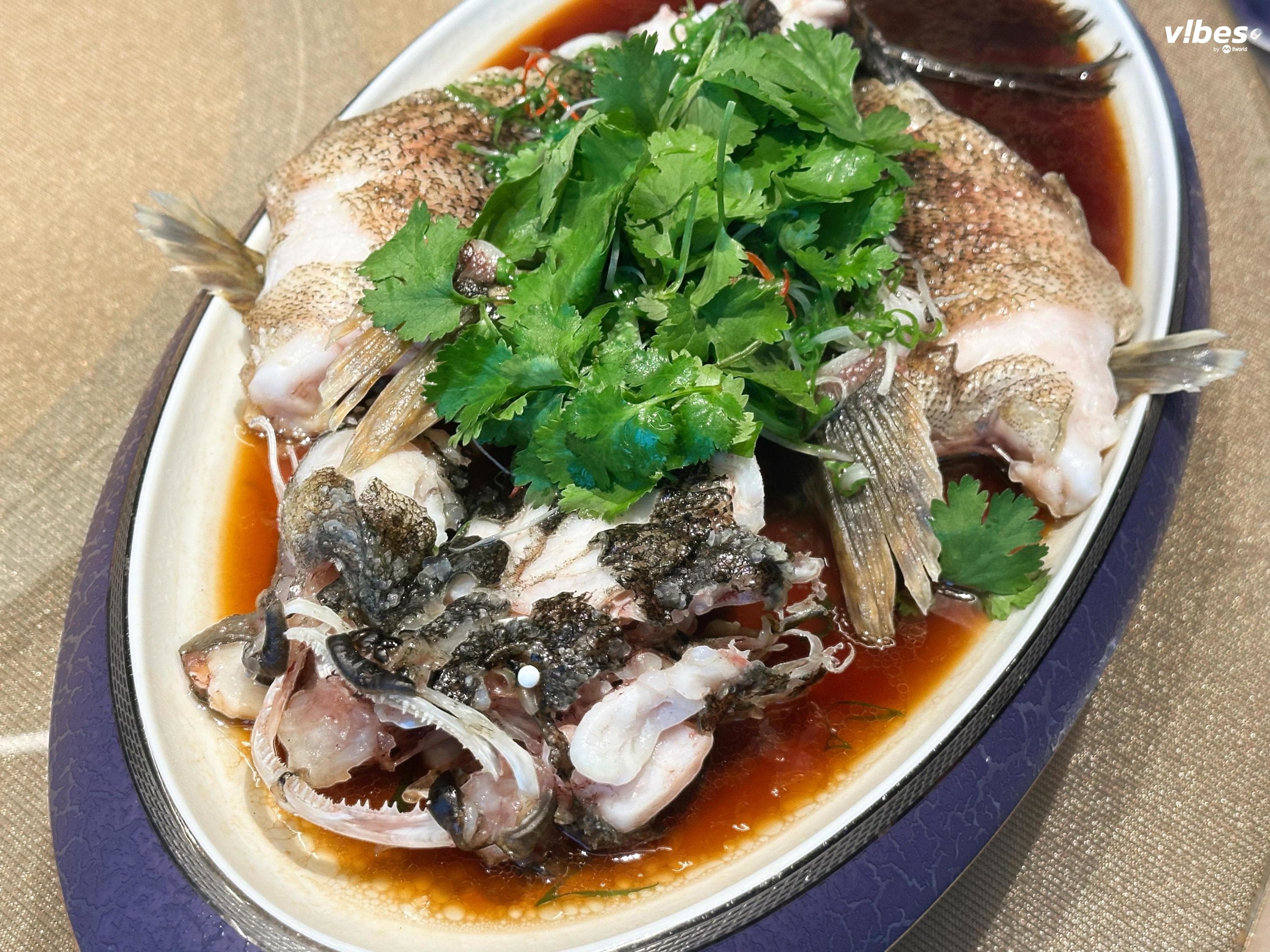 随之奉上的黄金蟹黄海味羹(Seafood Treasure Soup with Hairy Crab Roe),以浓醇汤底托衬蟹黄之鲜,暖胃亦暖心。主菜港式清蒸游水顺亮鱼(Hong Kong Style Steamed Live Marble Goby)是我最喜欢的一道,取鲜活顺壳鱼以经典港式技法蒸制,肉质细嫩如蒜瓣,尽显粤菜对食材本味的尊崇。