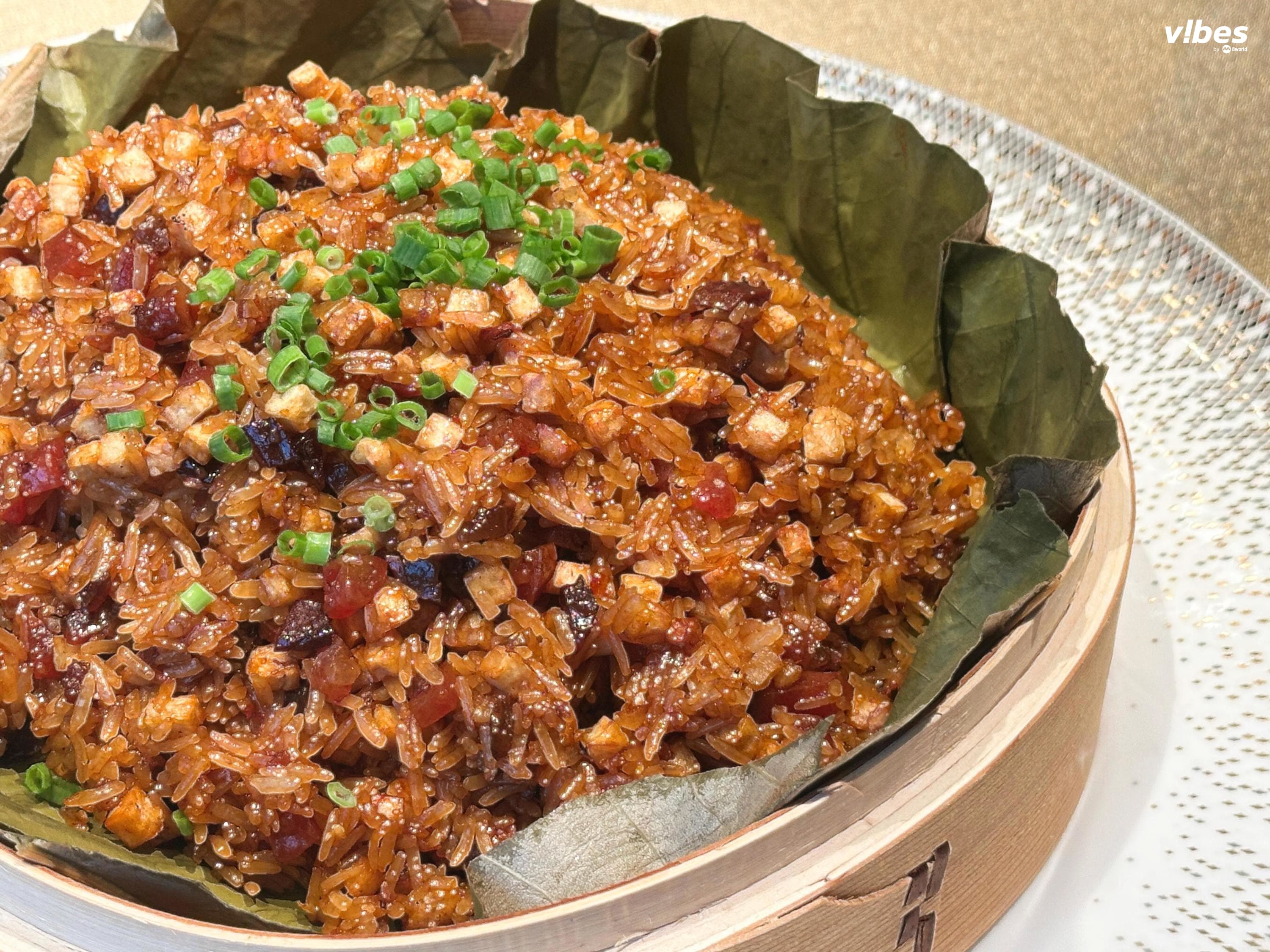 压轴主食荷香生炒糯米饭(Wok-fried Glutinous Rice with Chinese Sausage),以镬气十足的生炒技法,将糯米与腊味、虾米等共炒,再以荷叶包裹蒸制,米粒分明、香气复合,年味十足。