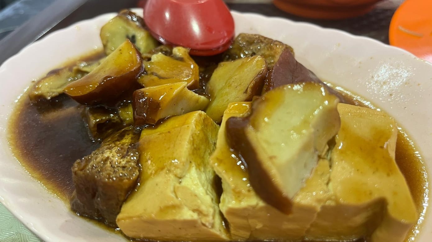 $3.50粿汁套餐看起来也有着相当高的人气,许多食客桌上都能见到。满满浓郁药材香气和撒上香菜的汤汁,即使少了肉味和油腻感,也一样清甜。配料的部分以卤豆干、豆卜和以面筋替代的猪肉、猪肠,对于不喜欢“猪肉味”的朋友或许也是好事一桩。