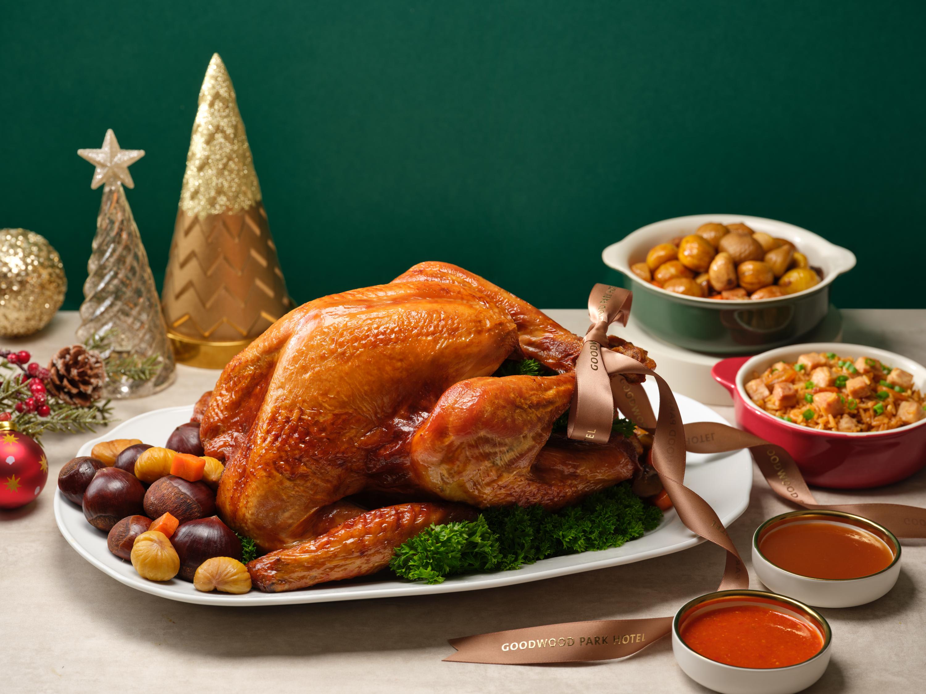Goodwood Park Hotel:良木园酒店今年推出多款创新火鸡美食。其蒸烤火鸡(Steam-Baked Turkey stuffed with Chestnut, Ham and Vegetables, served with Yam Rice and Chef’s Special Chilli Sauce,净价$260)需经过两日腌制,先慢烤至多汁,再烤至表皮金黄酥脆。火鸡内填入栗子、火腿、马蹄、香菇、青葱等丰盛馅料,并搭配香气扑鼻的芋头饭,适合8至12人。