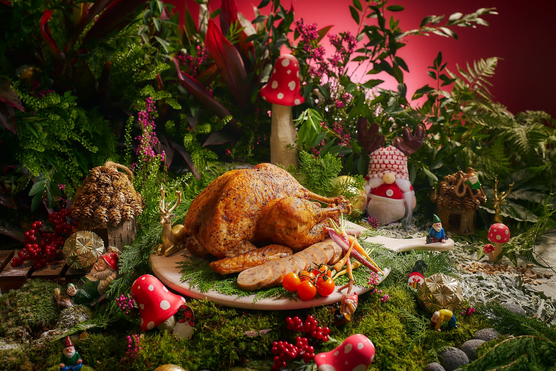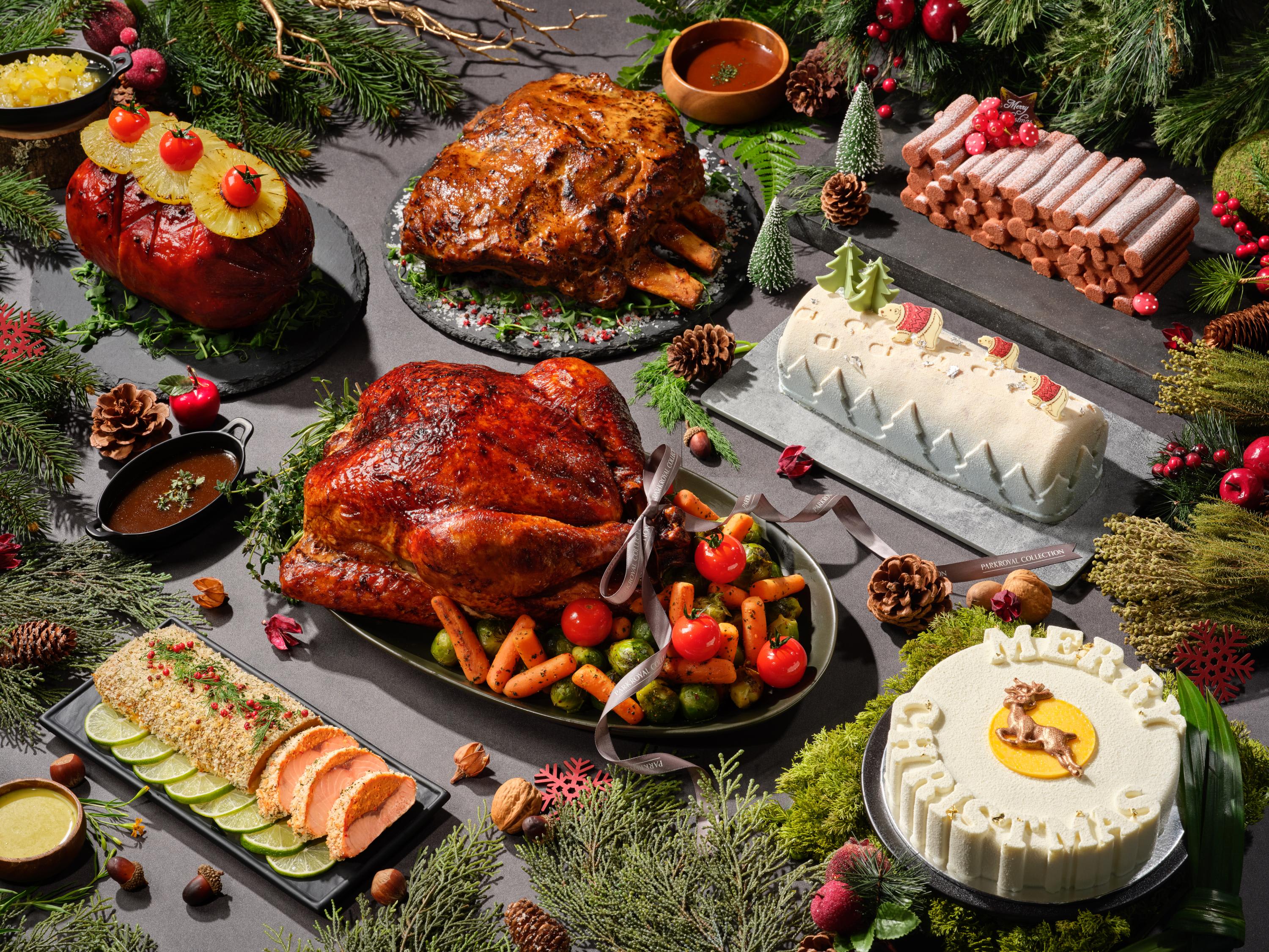 PARKROYAL COLLECTION Marina Bay:酒店的“Nature’s Noël”外卖系列中,传统烤雄火鸡(Traditional Roasted Tom Turkey,$248)是不可或缺的明星产品。5kg重的火鸡满载丰盛的栗子馅料,搭配马铃薯泥和自制内脏酱,足以成为餐桌上的焦点。