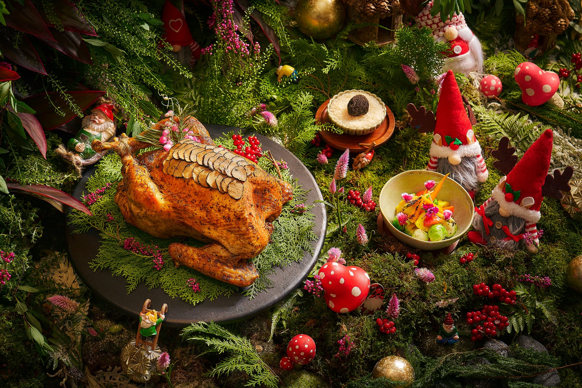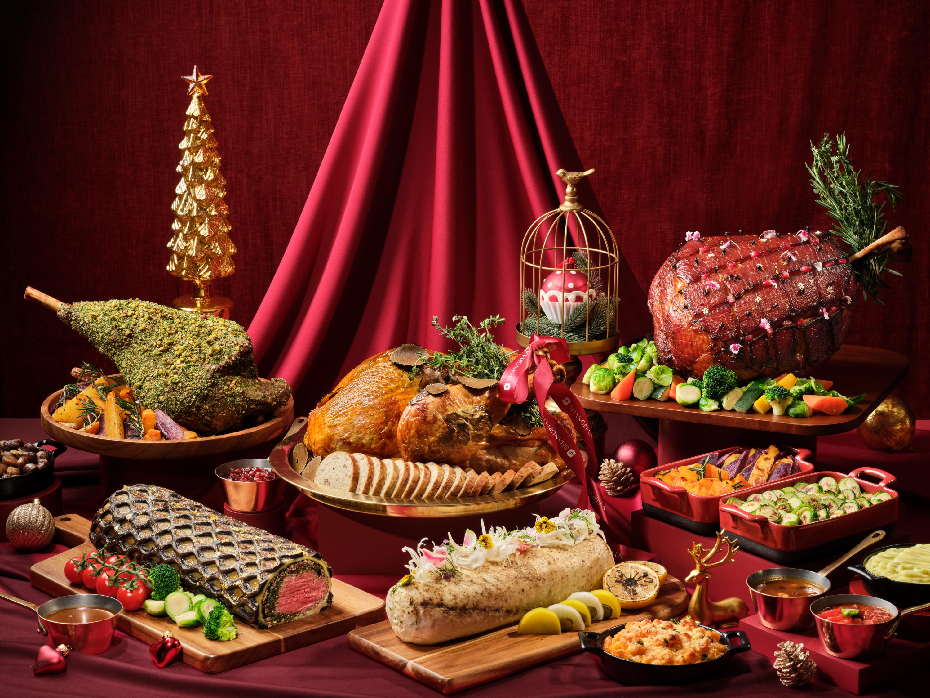 Shangri-La Singapore:酒店今年准备了两款风格迥异的火鸡。7kg的松露牛油烤全火鸡(Truffle Butter Roasted Whole Turkey,净价$288)以浓郁的松露牛油与香草提升风味,搭配多种配菜。4.5kg的魔鬼咖喱烤全火鸡(Devil Curry Roasted Whole Turkey,净价$258)则充满浓郁的欧亚风味,以香料腌制并填入魔鬼咖喱馅料。