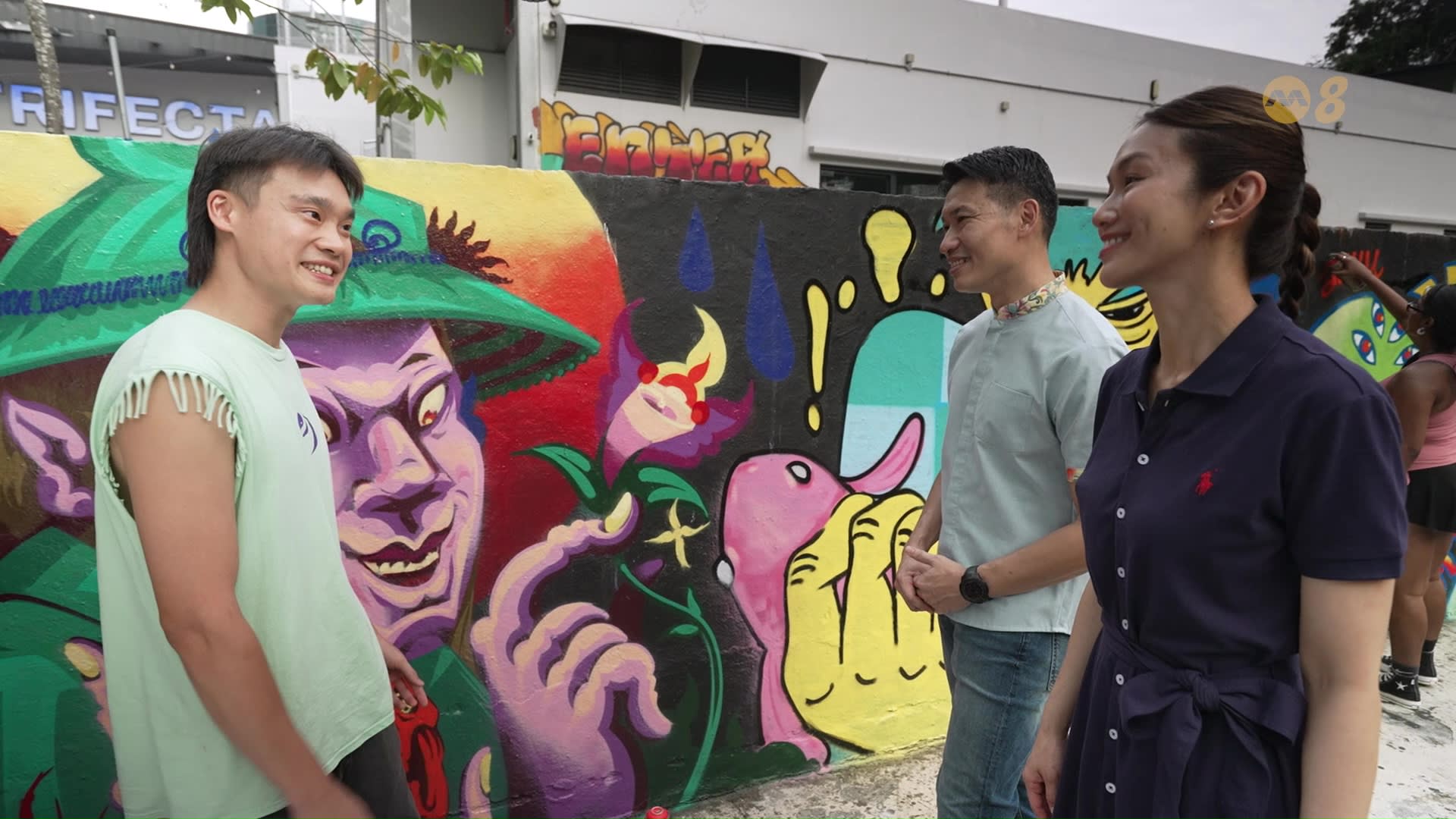 青年街头艺术画家李宋轩(左)希望未来能有更多空间让青年展示自己的作品,并通过绘画让世界认识新加坡。