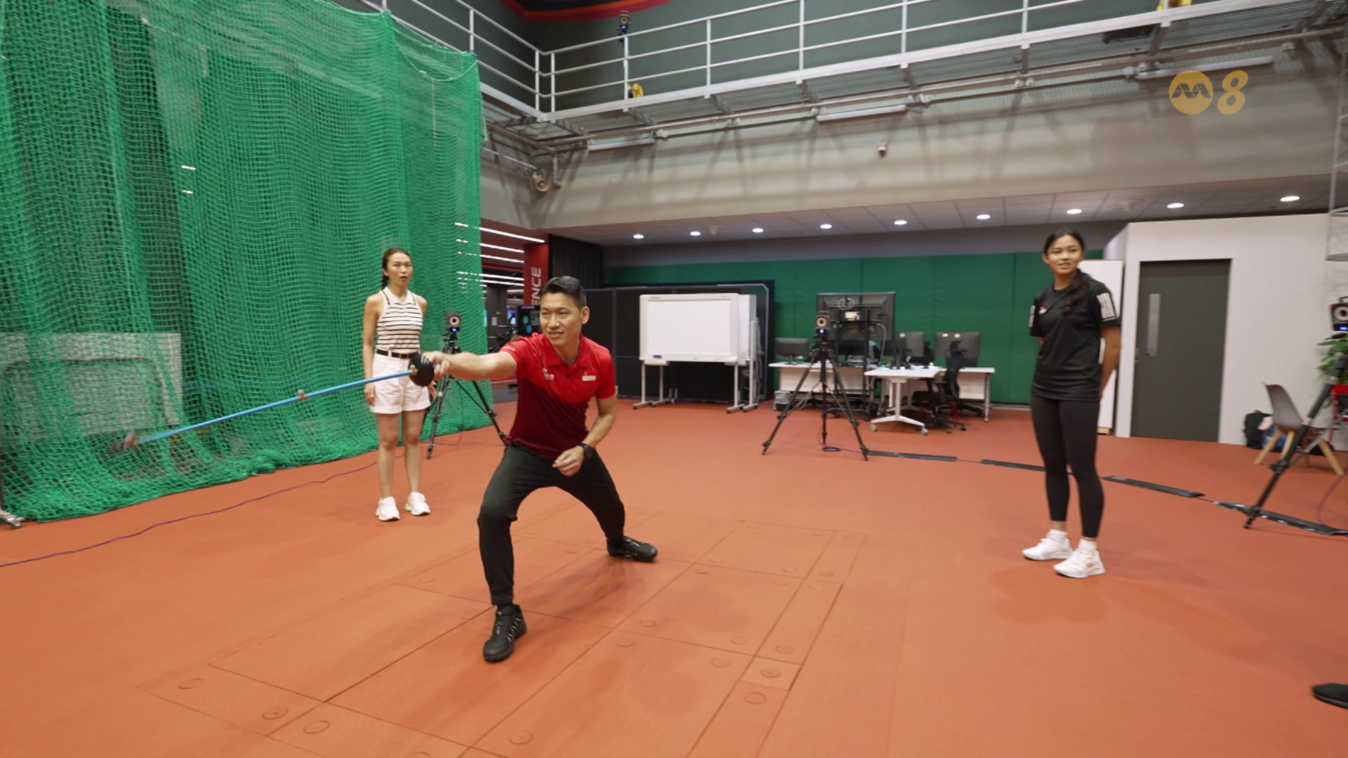 热爱运动,曾是田径选手的梁振伟亲自上阵,尝试击剑,了解高水平体育学院的系统如何检测击剑手弓步的速度与爆发力。