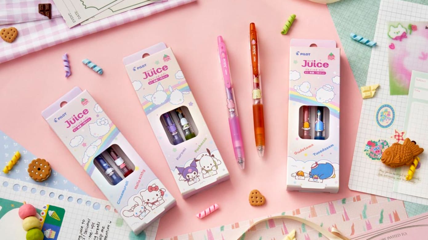 PILOT与Sanrio合作,推出限量版的Pilot Juice系列,以Hello Kitty、Cinnamoroll、My Melody 等经典角色为主题,设计灵感来自绘画和交友时的喜悦之感,展示了Sanrio可爱的角色们俏皮地趴着绘画的姿态,满是童趣。