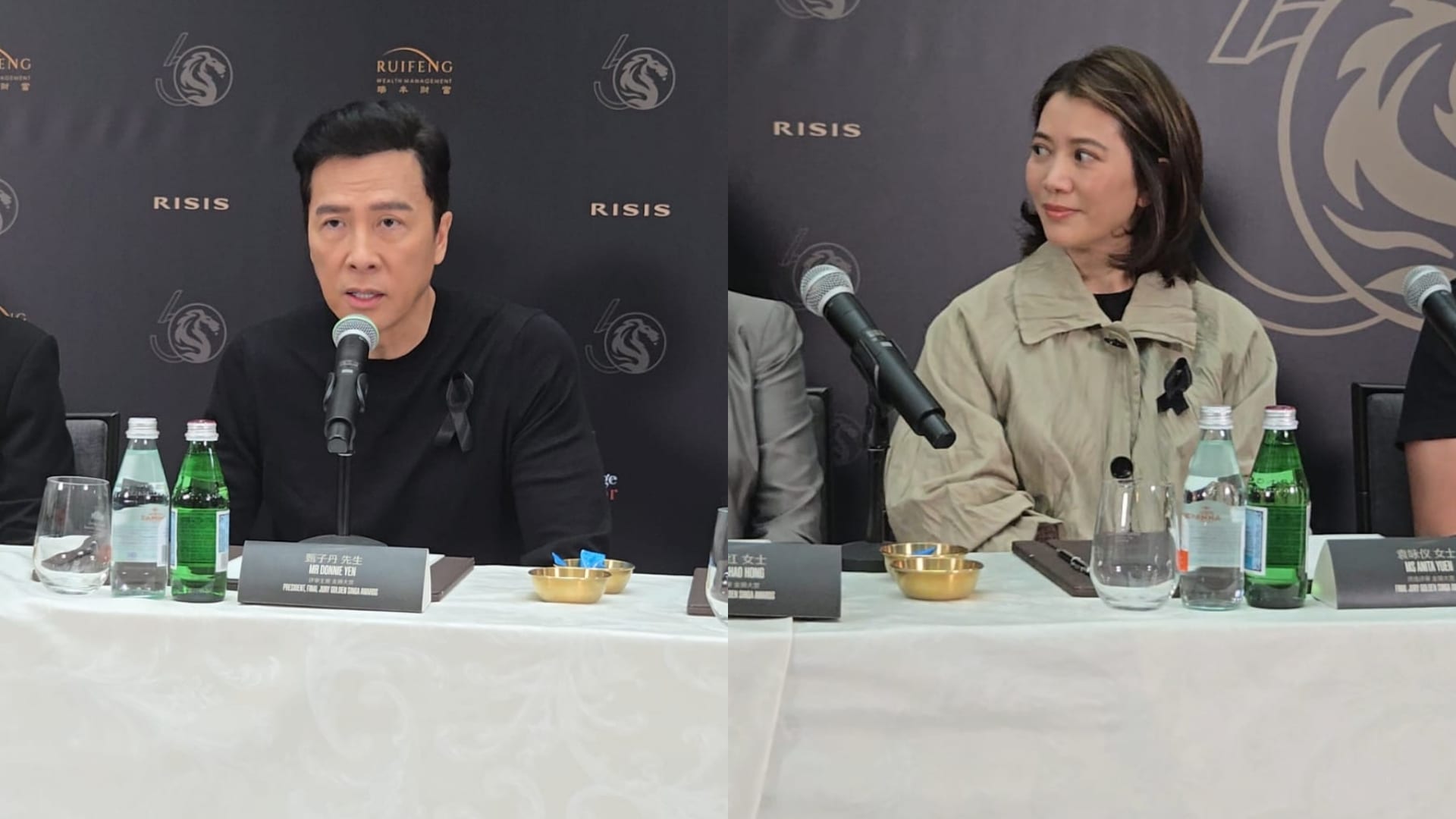 评审们抵达记者会现场时,均以素色服装现身,甄子丹与袁咏仪胸前更别着黑丝带,以行动向火患罹难者致哀。