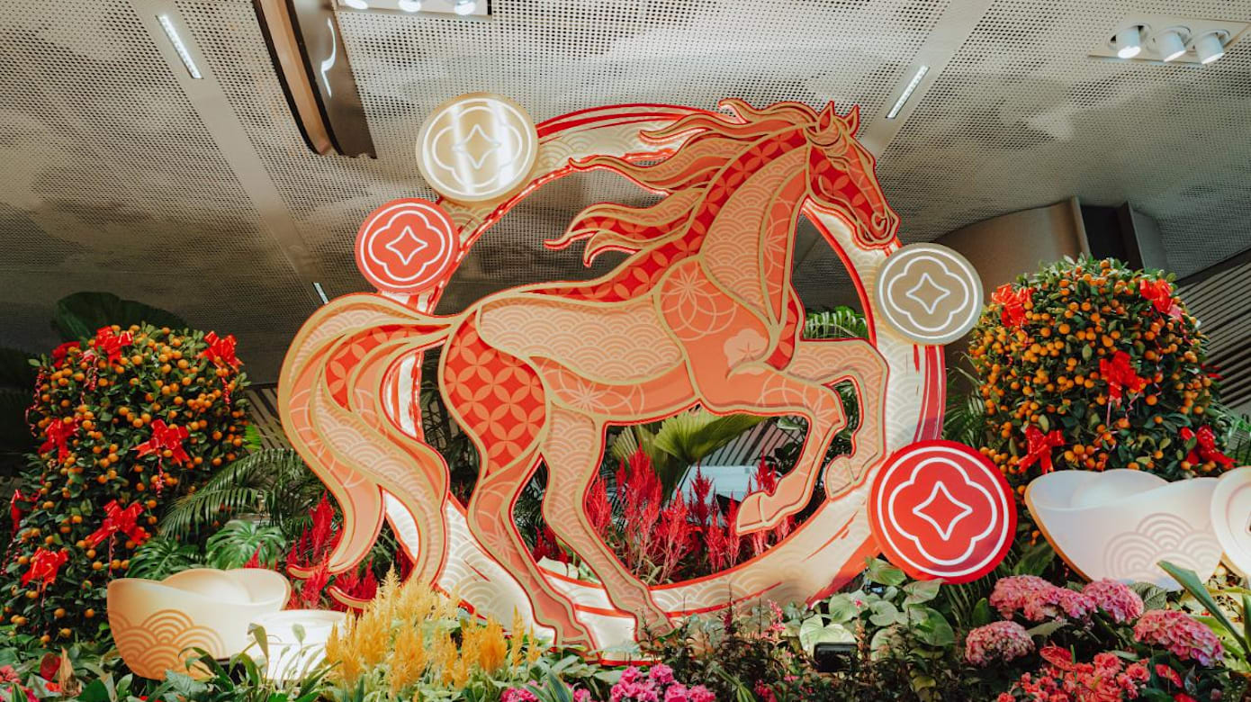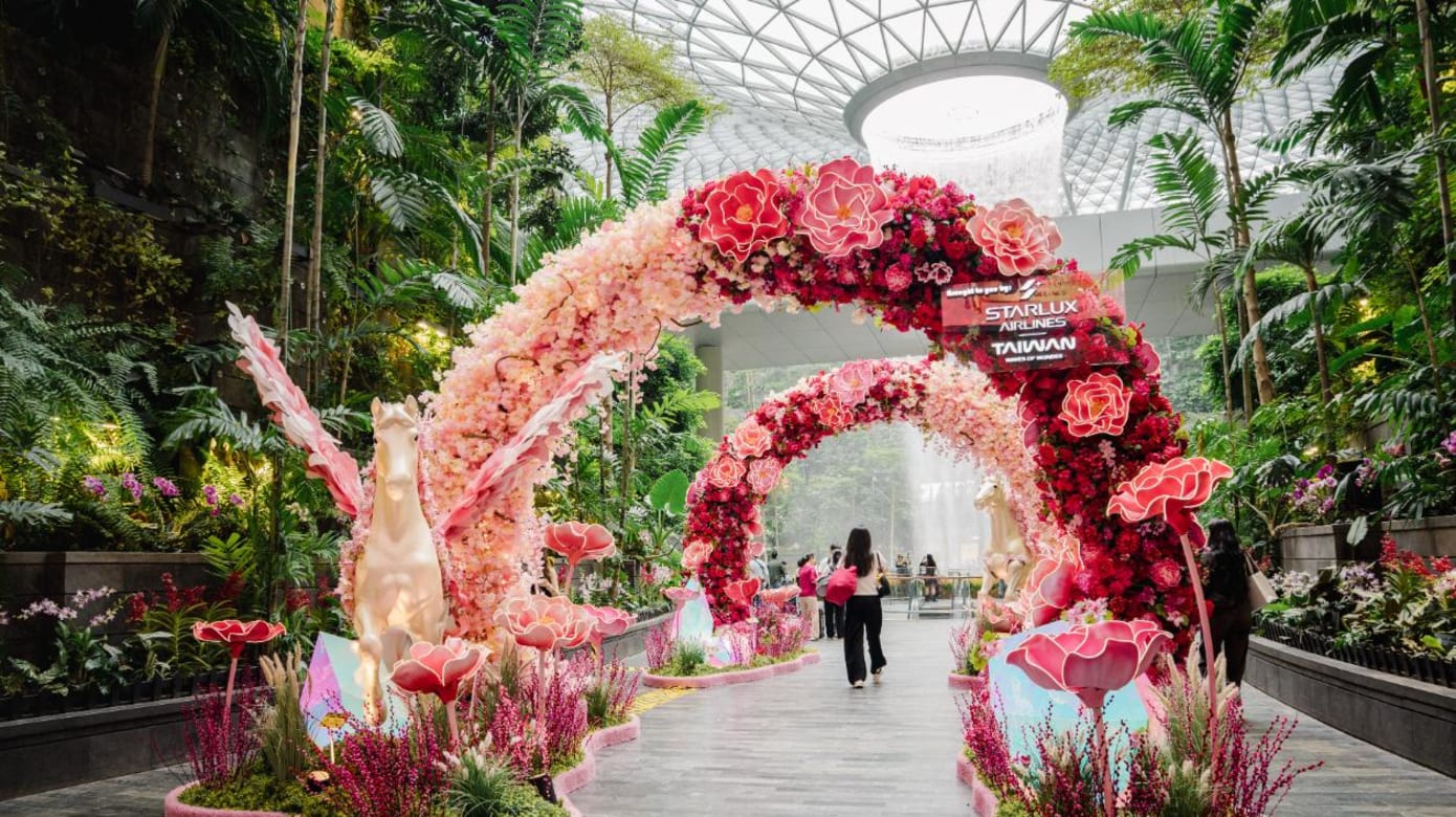 顶层星空花园的Petal Garden也化身春日花海,樱花、鸡冠花、玫瑰等缤纷盛放,让人仿佛走进浪漫春境。时间充裕的话还可逛樟宜机场,欣赏遍布T1、T2和T3共10个地点的火马雕塑与园艺花卉布置。