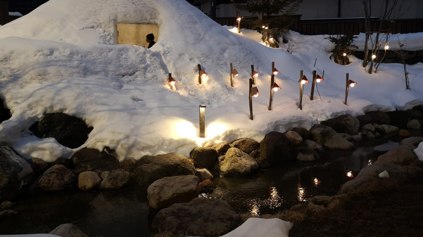 外头是沉静的雪夜,水池里温泉水汽缓缓升起,灯光在雪地里轻轻摇曳。端着热饮,看雪、看灯、看蒸腾的温泉河流。在深山冬夜里静静坐一会儿,雪还在落。