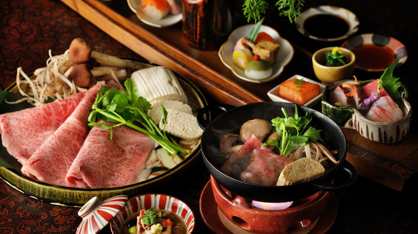 森林的气味之外,奥飞驒的风土也藏在餐桌上。旅馆的会席料理以当地食材呈献,飞驒地区最广为人知的莫过于飞驒和牛,与神户牛、松阪牛齐名的日本顶级和牛之一,肉质细腻、油花均匀。当晚端上桌的是寿喜烧做法,小锅里汤汁轻轻翻滚,薄切飞驒和牛在锅中略煮片刻即可享用,搭配绵滑山药泥,入口柔软细致,脂香丰润。