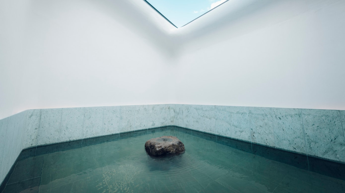 界奥飞驒分成几座建筑,以中庭为核心公共空间。石墙层层叠叠,泉水顺着曲折的通道缓缓流淌,两侧种植着本地林木。沿着温泉流经的小路前行,重现步行前往公共浴场泡澡的景象。庭院一角设有足浴区,可以停下脚步,让温泉暖意从脚底升起,同时放眼远处山峦。