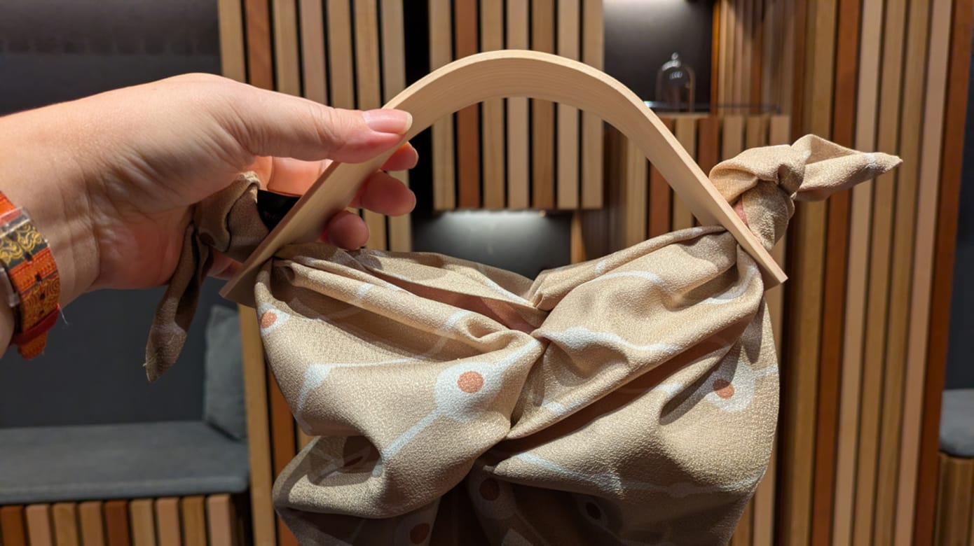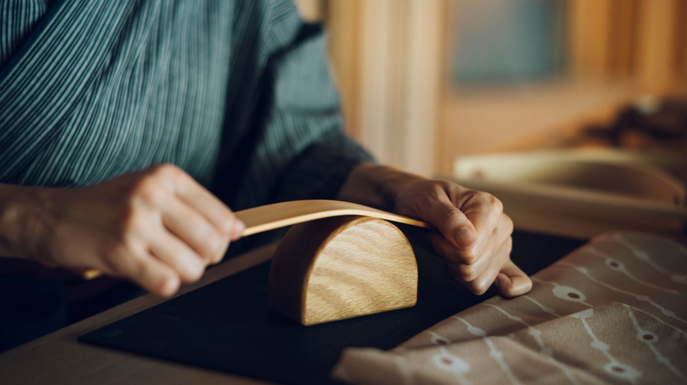 奥飞驒温泉乡的森林覆盖率高达90%,自千年以前便传承着与木材息息相关的飞驒匠人文化。曲木工艺是最具辨识度的传统技艺,想要近距离了解,可参加旅馆内的飞騨木工体验。制作过程并不复杂:每人自选一片木材,经高温加热把木材软化,沿着模具慢慢压下,木材弯折成优雅形状,冷却后固定即成为提袋手柄,绑上界原创的风吕敷巾后,就成为一款自制小手袋,感受木材和手作的温度。