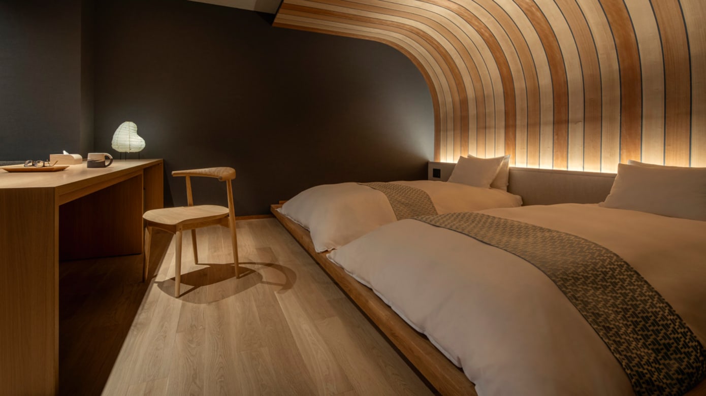 客房设计也不同于传统温泉旅馆。家具与装饰多采用飞驒地区的木材与工艺,处处展现当地匠人文化。最引人注目的是弧形的床头板,以飞驒天然木材拼接制作,木纹与色调自然温润,线条柔和优雅,源自当地传统曲木工艺。房内配有飞驒曲木椅,墙上有飞驒春庆漆器装饰,案头的和纸灯笼散发柔和光线,让空间显得安静而温暖。