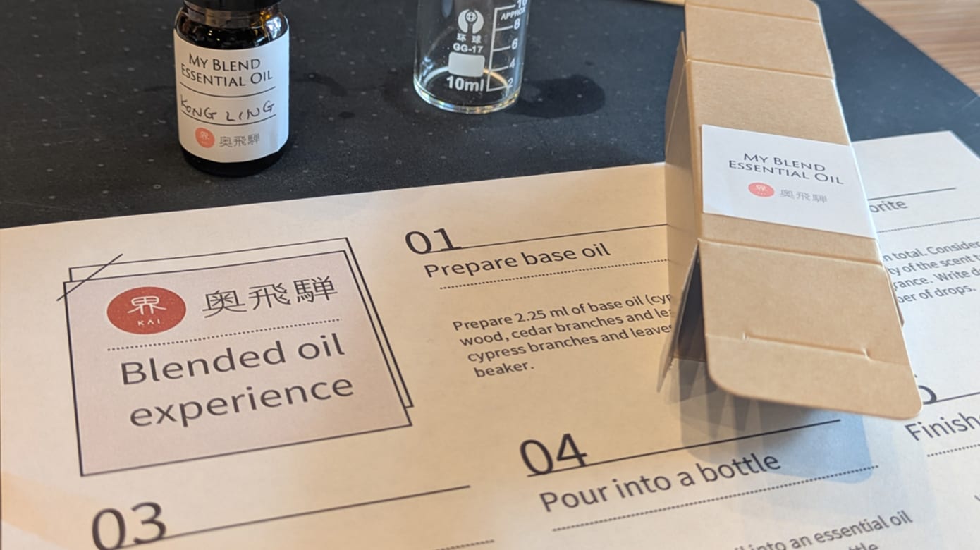 另一项相关体验是精油混合体验,以飞驒木材萃取的精油为基础,搭配薰衣草、甜橙、佛手柑等不同功效的花果精油,自行调配出专属的香氛,把奥飞驒森林的气味带回家。
