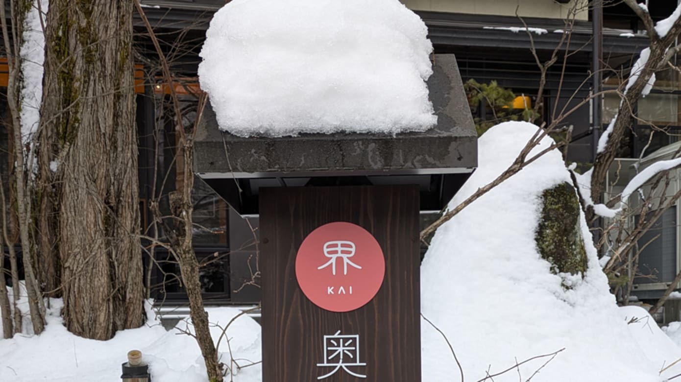 下榻的界奥飞驒(KAI Okuhida)是日本集团星野(Hoshino Resorts)旗下的温泉旅馆品牌。2024年开业时是品牌首次进驻岐阜县,成为平汤温泉区最新的旅宿坐标。室内新颖现代,外观低调融入老区,建筑分置于街道两侧,没有显眼大门,小小的招牌覆盖着积雪,走出旅馆就是社区日常。