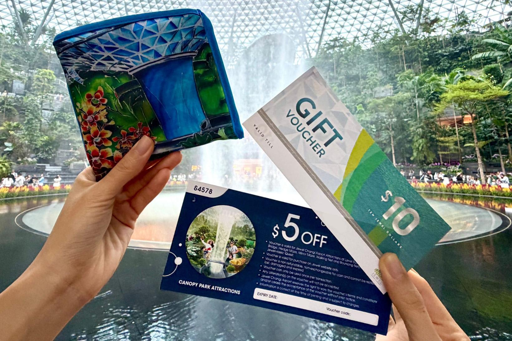 为答谢粉丝并庆祝得奖品牌,凡在星耀樟宜任一得奖店铺单笔消费满$30,即可兑换独家好礼,包括$10星耀樟宜购物礼券、$5景点礼券和一个限量版环保袋。