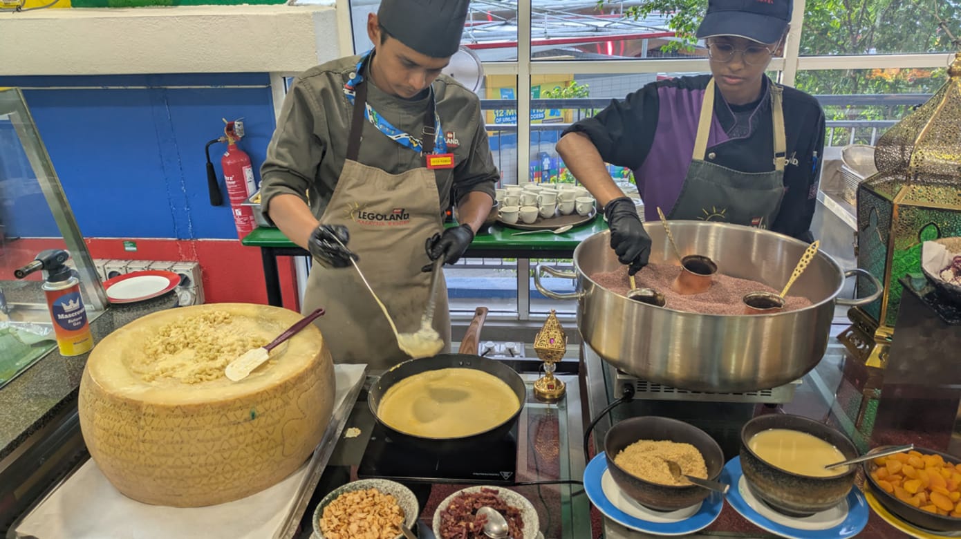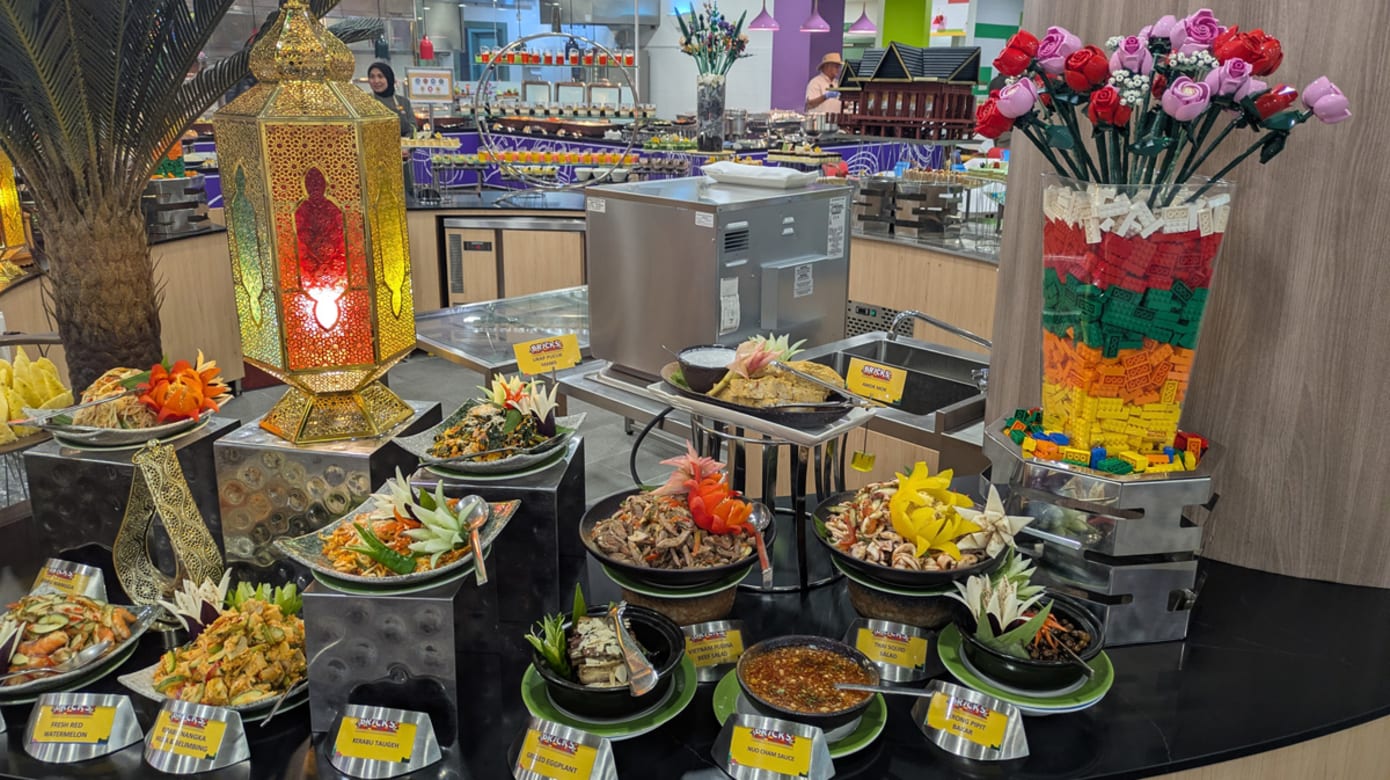 入夜,重头戏转移乐高乐园酒店全新翻修的主餐厅Bricks。配合斋戒月推出Flavours of Nusantara群岛风味开斋自助晚餐,2月21日至3月18日限定登场,汇集超过200道区域特色佳肴,从熟悉的家常风味到现场现做的料理档口,极尽丰盛。菜色涵盖多款经典马来西亚与群岛料理,如阿叁鱼、沙爹、牛肺、牛筋、羊肉黄姜饭,以及少见的发酵榴梿巴丁鱼;现点面摊现做的面条热气腾腾,甜品有传统黑糯米、摩摩渣渣,还有现做的kueh dada。饮料丰富多样,包括香浓的手工土耳其咖啡。用餐的同时还有现场乐队表演,增添轻松愉快的节日气氛。2月20日以前预订可享有早鸟优惠,平时(星期一至四)成人RM168,周末(星期五至日)成人RM200。