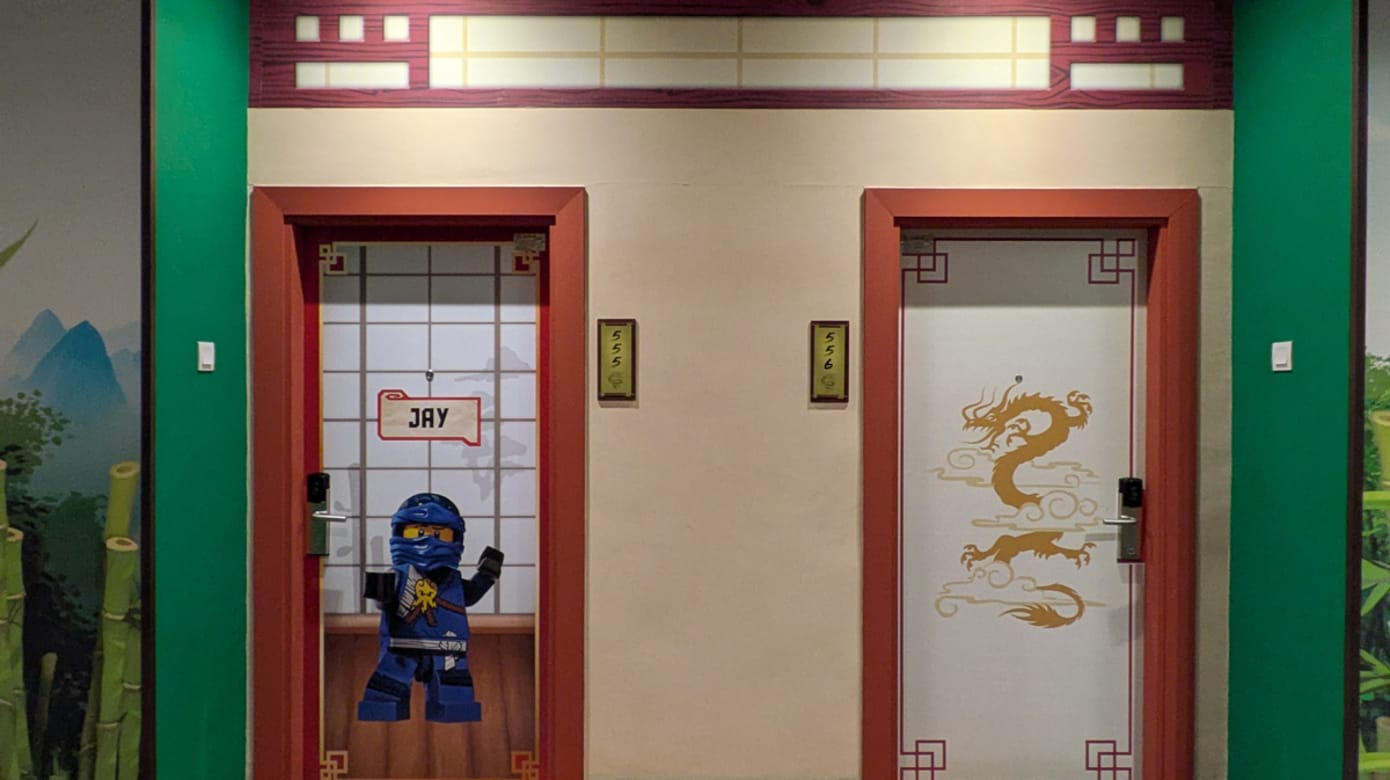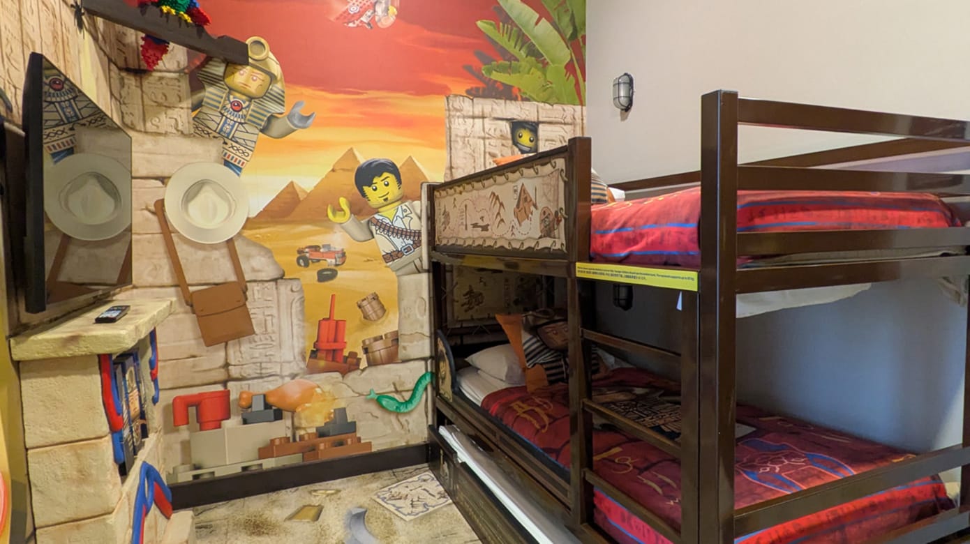 酒店客房为乐高系列主题,包括海盗、城堡、探险、幻影忍者,不同楼层各有不同设计,即使多次造访,依然能感受到新鲜感。所有客房都是家庭式格局,成人睡大床,小朋友拥有独立的上下铺双层床与专属电视,互不干扰。