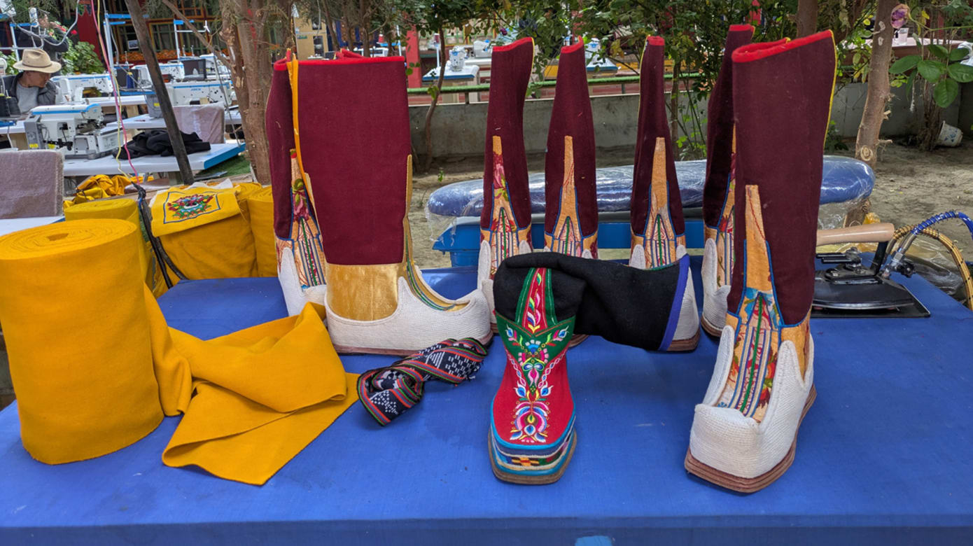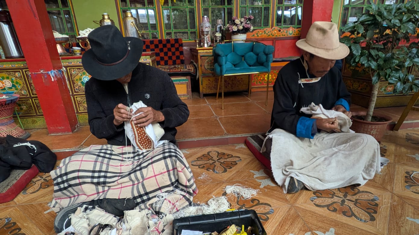 夏鲁寺带动了村子里的经济,村子里参观了两处非遗手工艺展示点,都与夏鲁寺密切相关。夏鲁优章彩靴手工技艺是西藏传统手工制鞋技艺的代表,家族自18世纪起便为历代班禅大师制作彩靴及服饰,所有工序皆为纯手工缝制,用料考究,工艺繁复。作坊里师傅们分工明确,安静地坐在各自的位置上,低头缝制,细致入微地为我们演示着这一门手艺的细节与温度。