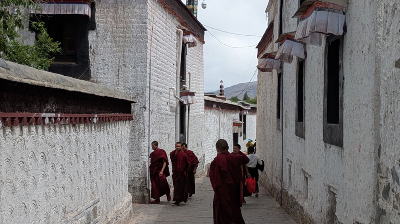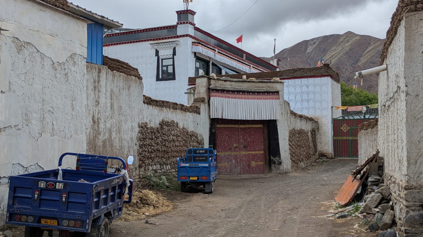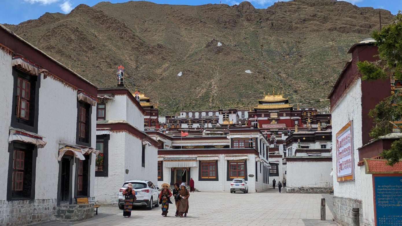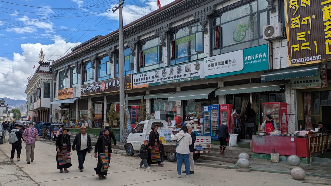 走出寺院,日常生活便悄然展开。典型的藏式聚落,街道不宽,两侧是厚重白墙与红檐窗棂构成的藏式民居,有些门口还挂着绘有宗教图案的布幔。也有一些藏式小餐馆,门口悬着藏文招牌,木窗里透出酥油茶的香气。