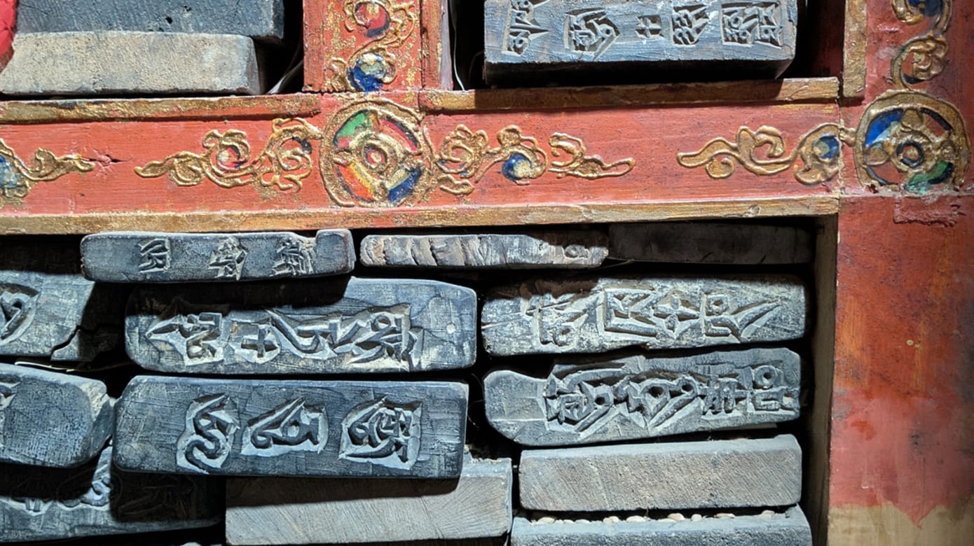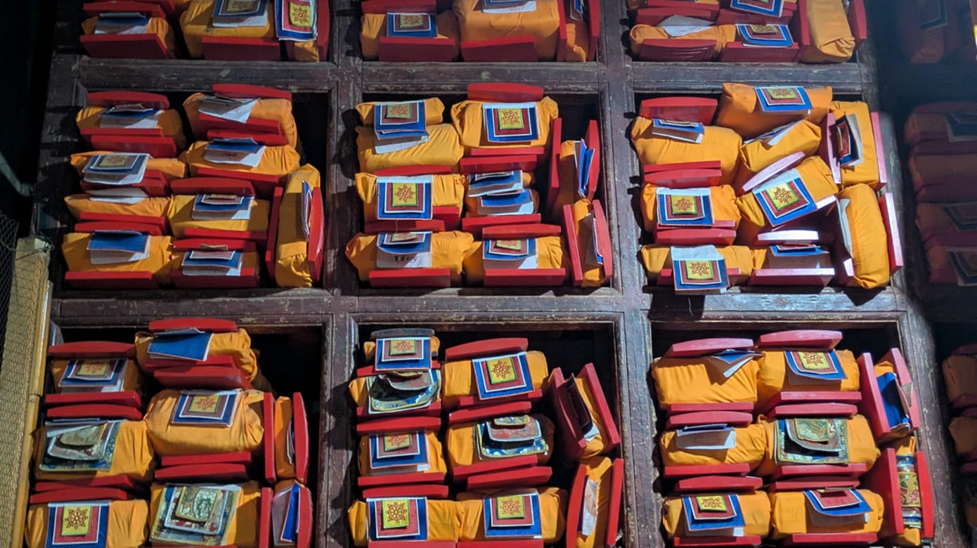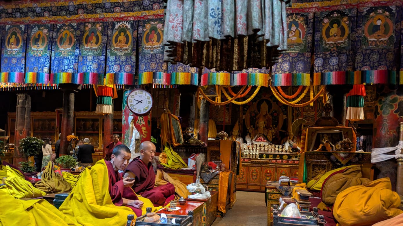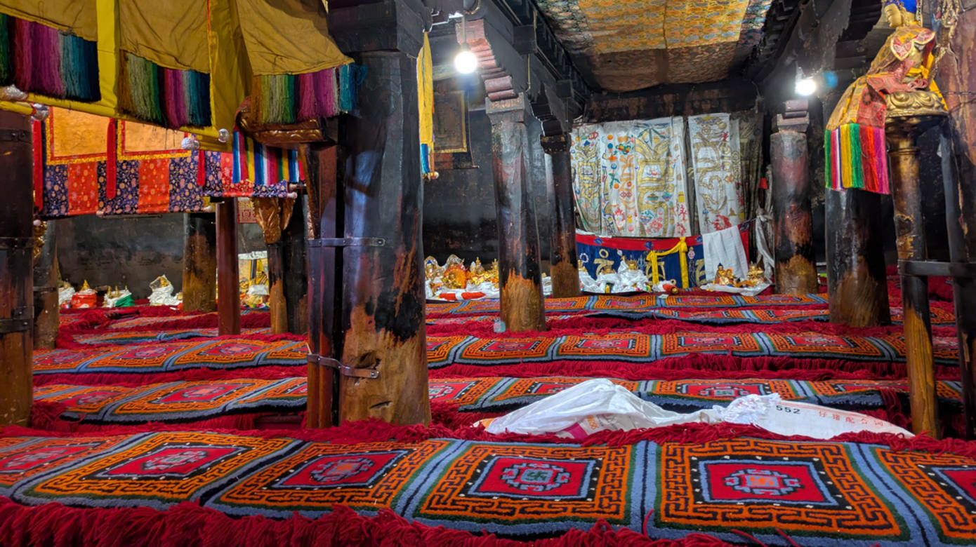 佛像前点着酥油灯,挂着哈达,摆满各种各样的供品,案几上撒满香火钱,各色钞票零散堆叠。身穿传统藏装信徒虔诚地低头膜拜,双手合十,喃喃诵经。僧人们散坐在经堂席位,低声交谈,不动声色地看着我们这些远道而来的访客。头顶上方悬挂着成排的彩色布帘与幔帐,红黄蓝绿白五色交织,在昏暗中微微晃动。墙上是斑驳却依旧生动的壁画与唐卡,寺里还保存有大量稀有文献与手抄本,看到整面墙的经书,以及藏文经文的雕刻版。