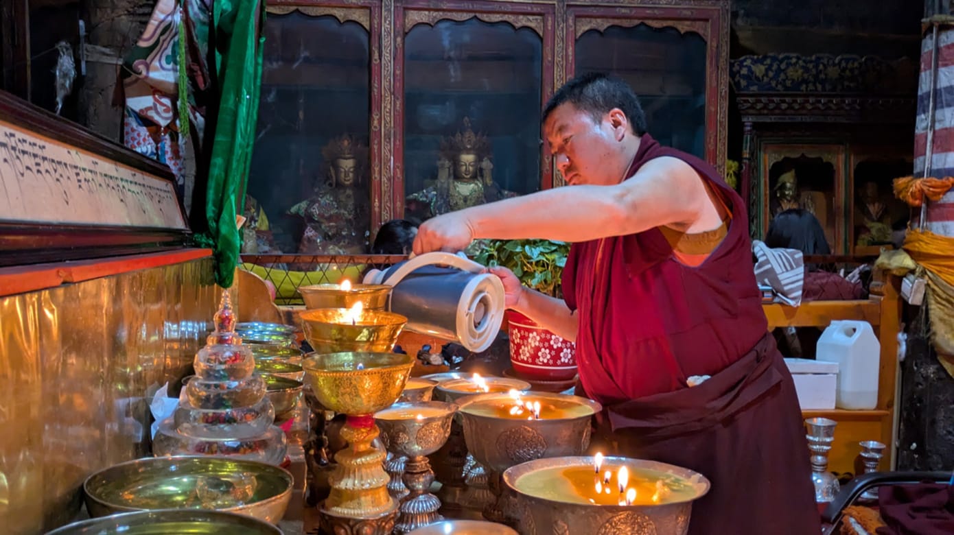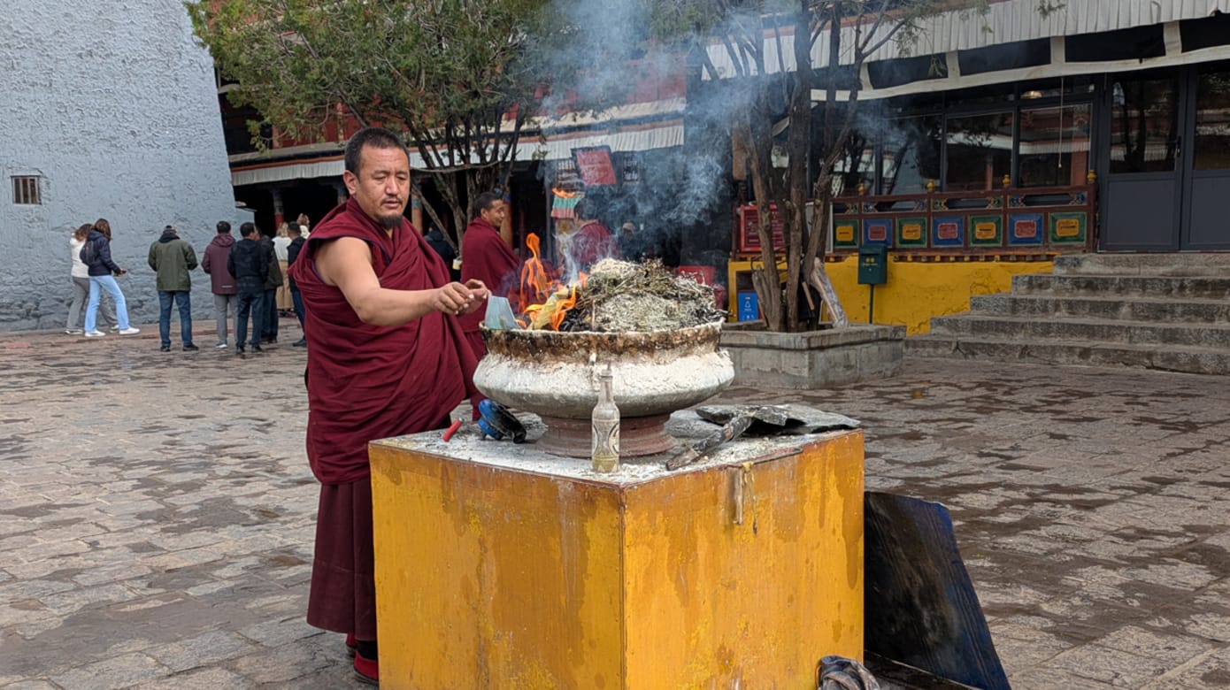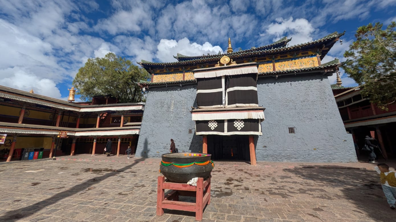今天的夏鲁寺相对低调,不像热门景点那样人潮拥挤,寺内多是本地信徒与僧侣,气氛安静、庄严。寺院中缓步而行,院落中僧人正在煨桑,松枝与柏木燃起的香烟袅袅上升,在阳光下化成一道白雾,空气中弥漫着焚香,神圣而温柔。