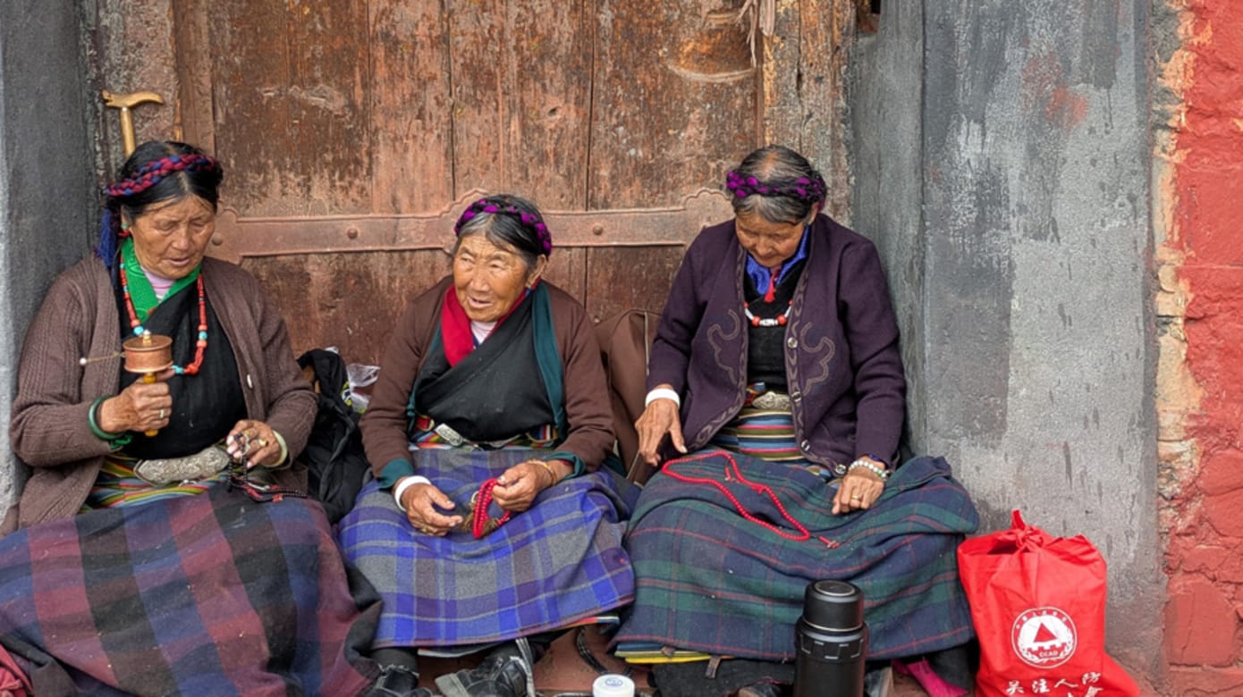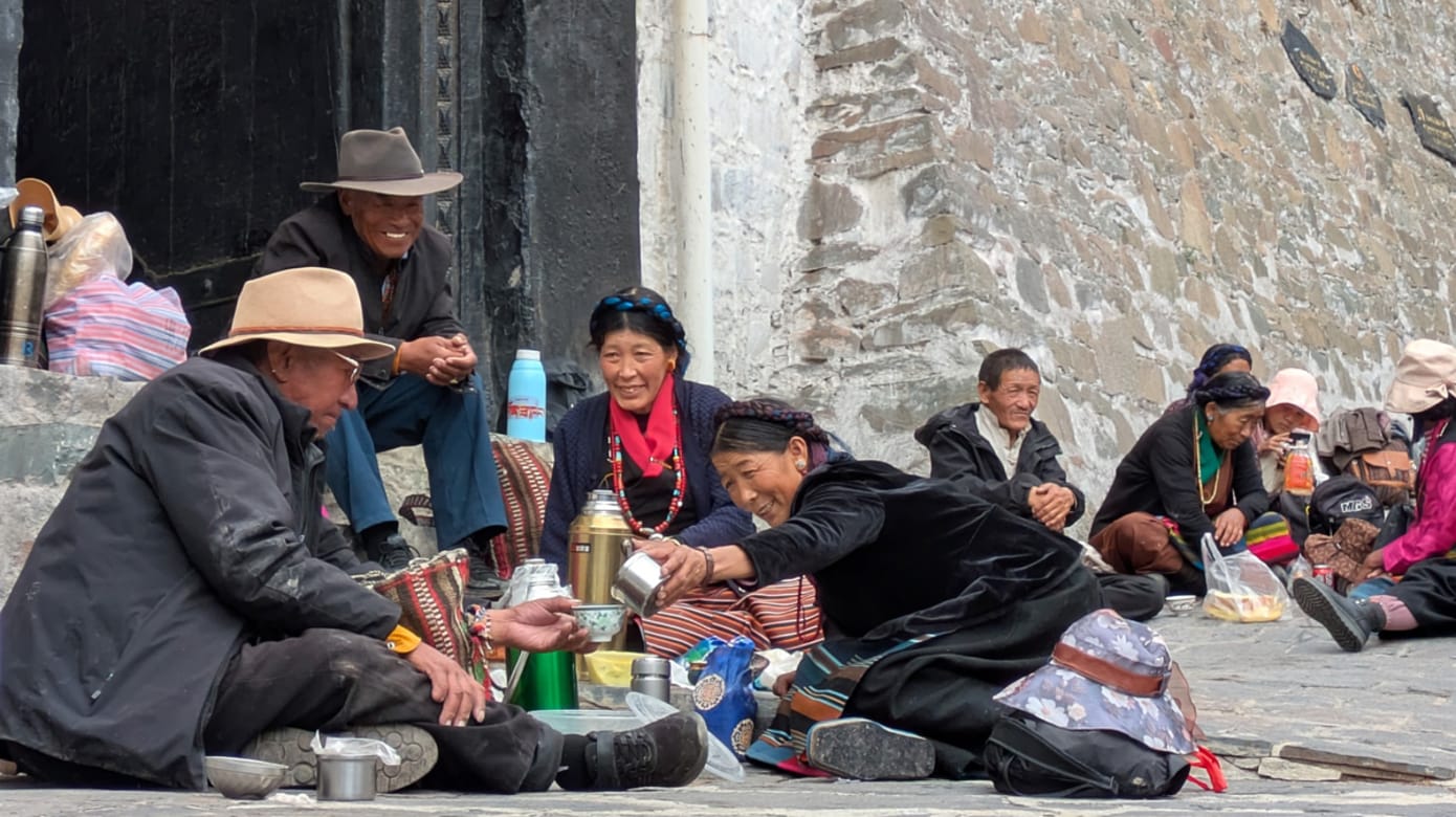 造访之日正值当地信众做法事的时期,寺院里格外热闹。信徒们或转经祈福,或席地而坐,三五成群围着吃饭喝茶。身穿传统藏服的老人家缓步而行,手中轻轻摇着转经轮,低垂的目光中藏着长年累月的祈愿。