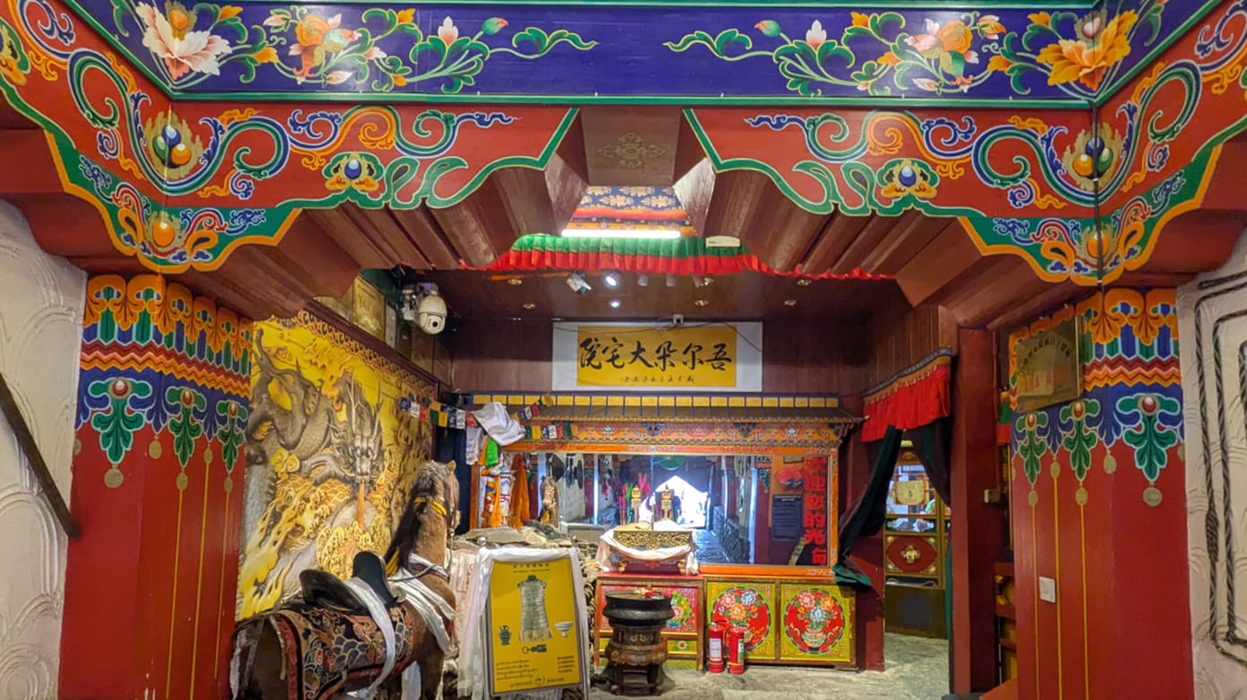 进入主殿,光线幽暗,色彩丰盈。殿中布置密集,几乎每一寸空间都藏有各种宗教象征。可以自由拍照,而面对这满目的神圣符号,一时竟不知镜头该落在哪一个角落。