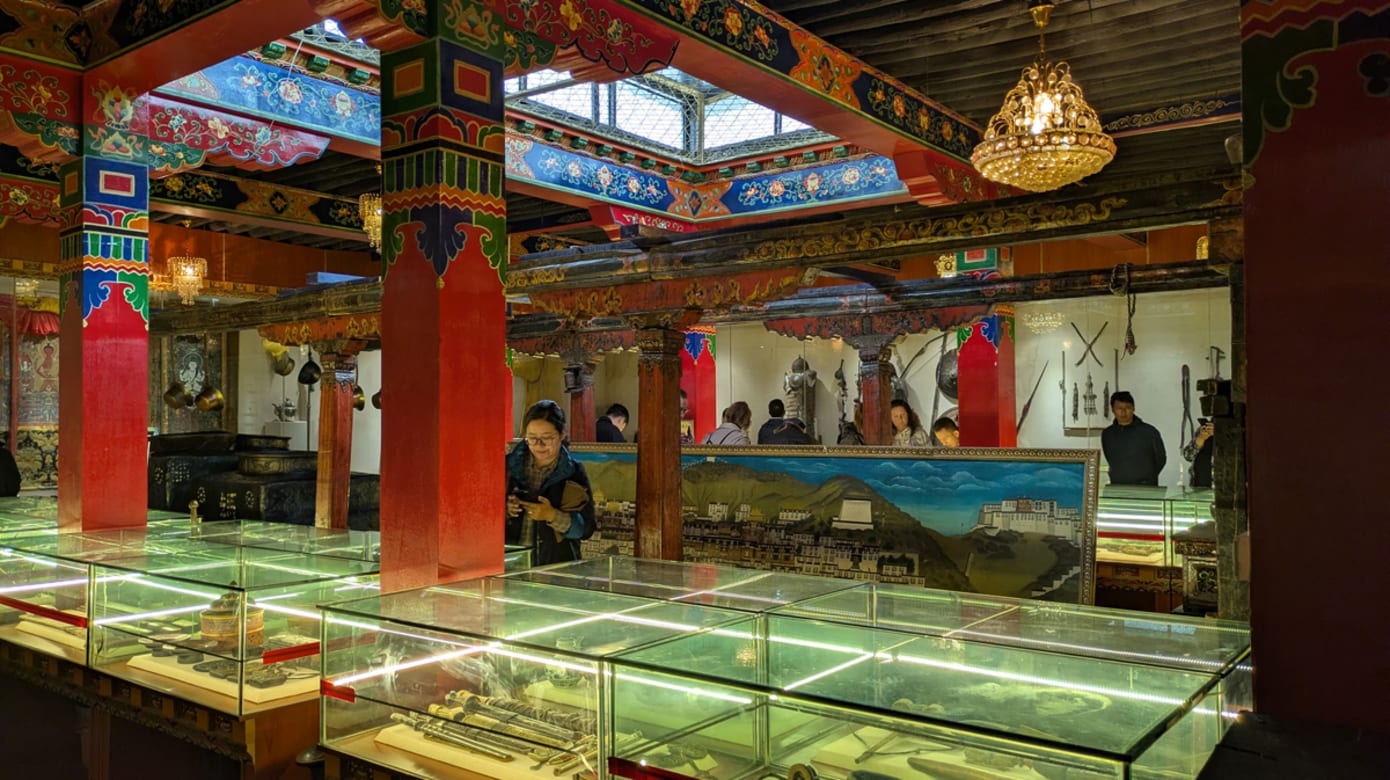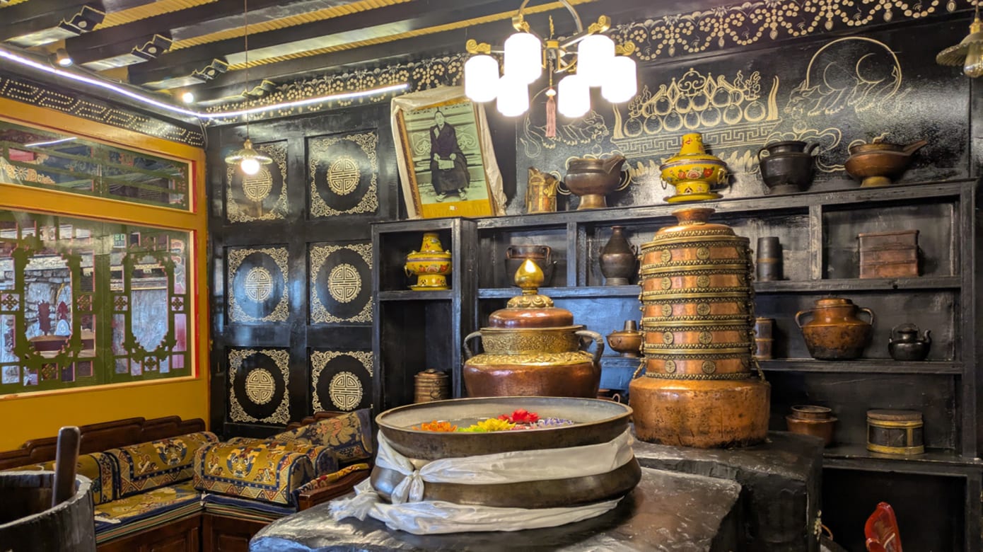 沿着宅院深处一探,还自带一家文化展览厅,展品多为祖上传袭好几代人的收藏。馆内展品琳琅满目:盔甲、马鞍、首饰、佛牌、钱币、邮票、印章、厨具……不仅是一段饮食时光,更像是一趟藏文化的漫游。