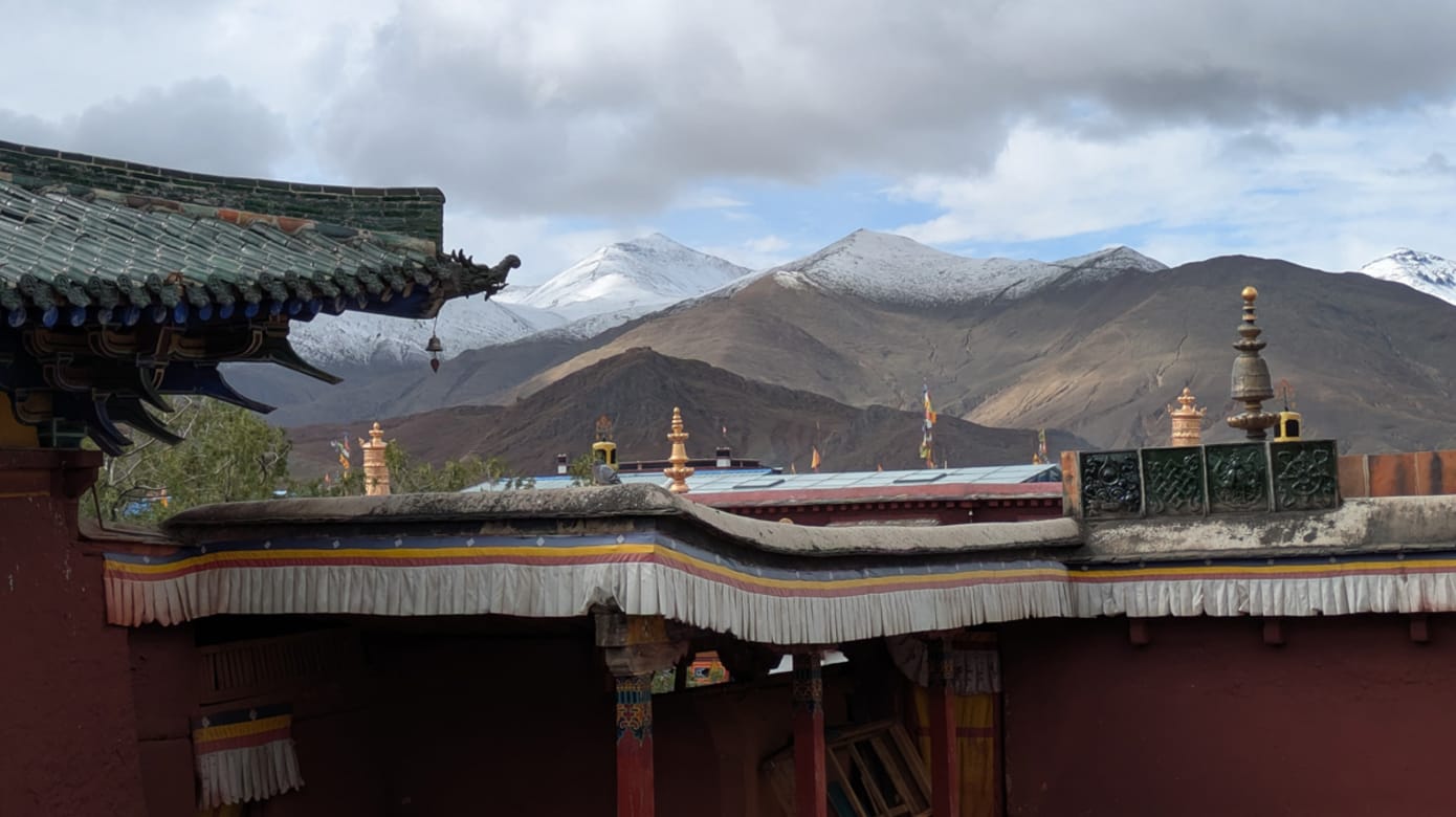 拾级而上,顶楼天台可近距离欣赏寺庙的中式屋顶,一个角落刚好可以眺望远处雪山。寺院的红墙绿顶在前,洁白雪峰在后,信仰的建筑与自然的崇高在此刻交叠入画,静默却震撼。
