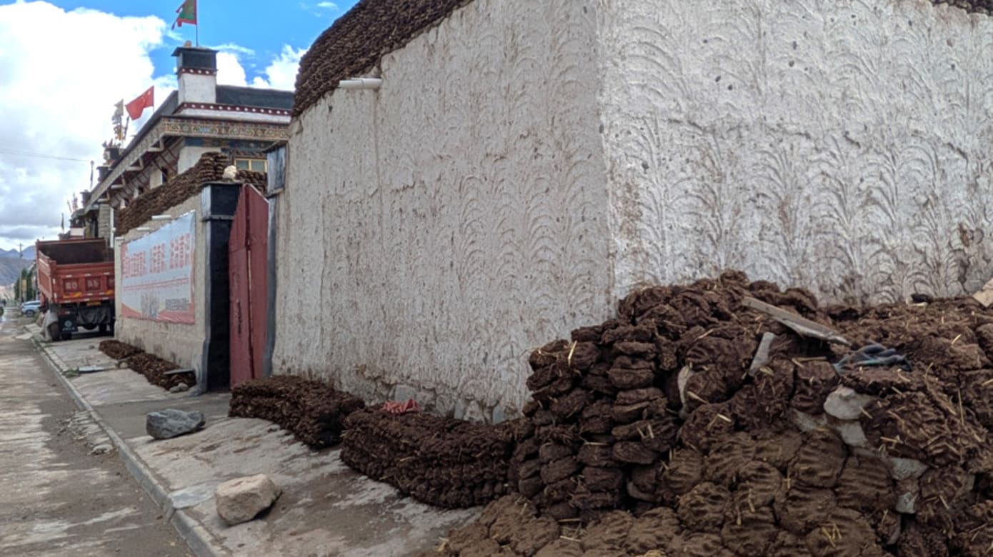 最有趣的是看到民居的白色外墙,摆放着一摞摞晒干的牛粪,拍成圆饼状,一层层高高叠起。趋近闻着并无异味,对高原牧民来说,这是最实用的生活资源,取暖煮食都靠它,是藏地人家屋檐下不可或缺的燃料。