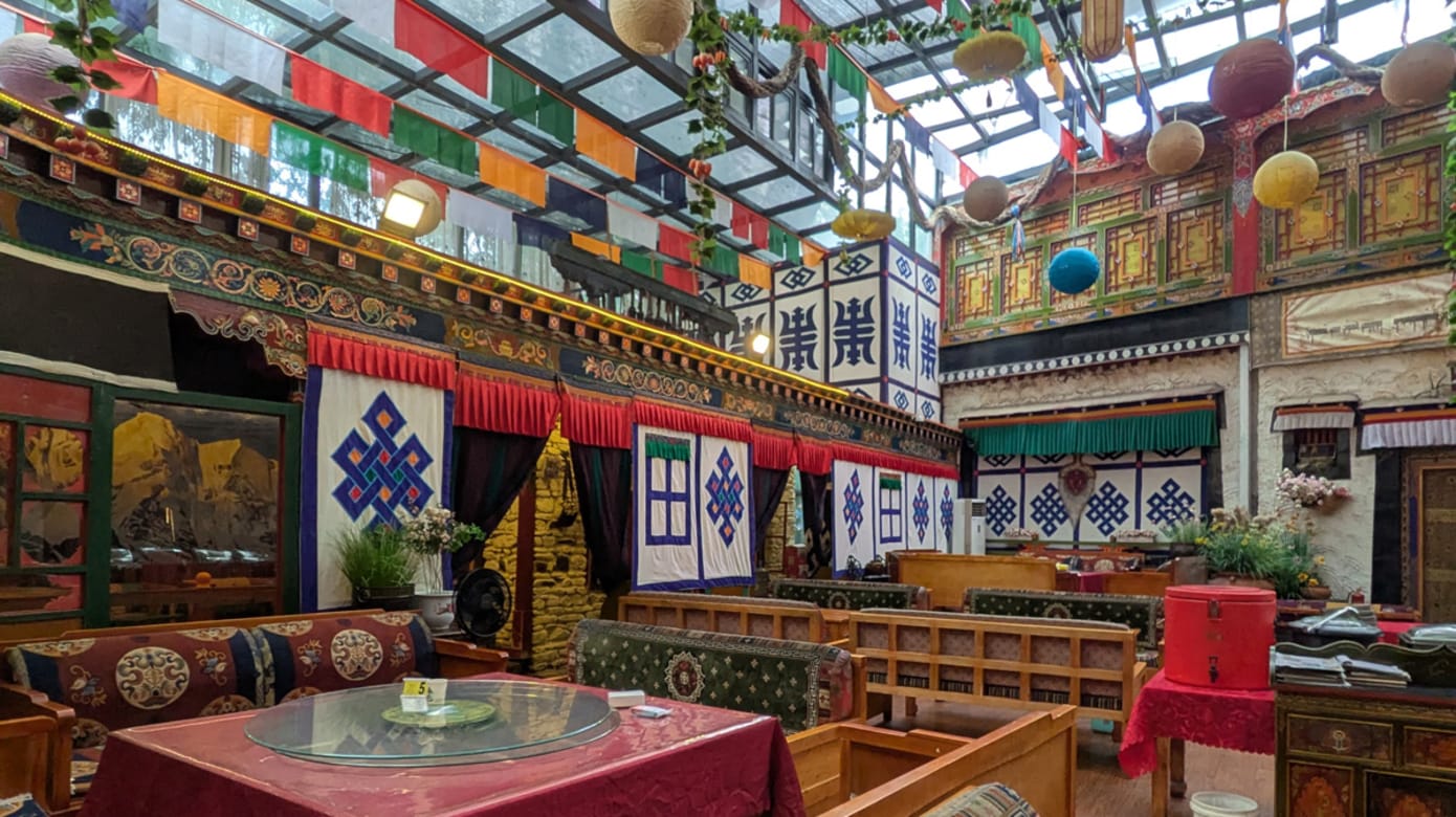 藏餐很多人吃不习惯,重点是室内布置极具民族风情,有如贵族宅院。墙上悬挂唐卡与藏毯,木柱与屋梁保留原色,雕刻繁复;沉稳的藏式家具、鲜明的布帘与垂挂饰物,无处不透出浓郁风情,各个角落都很适合拍照。