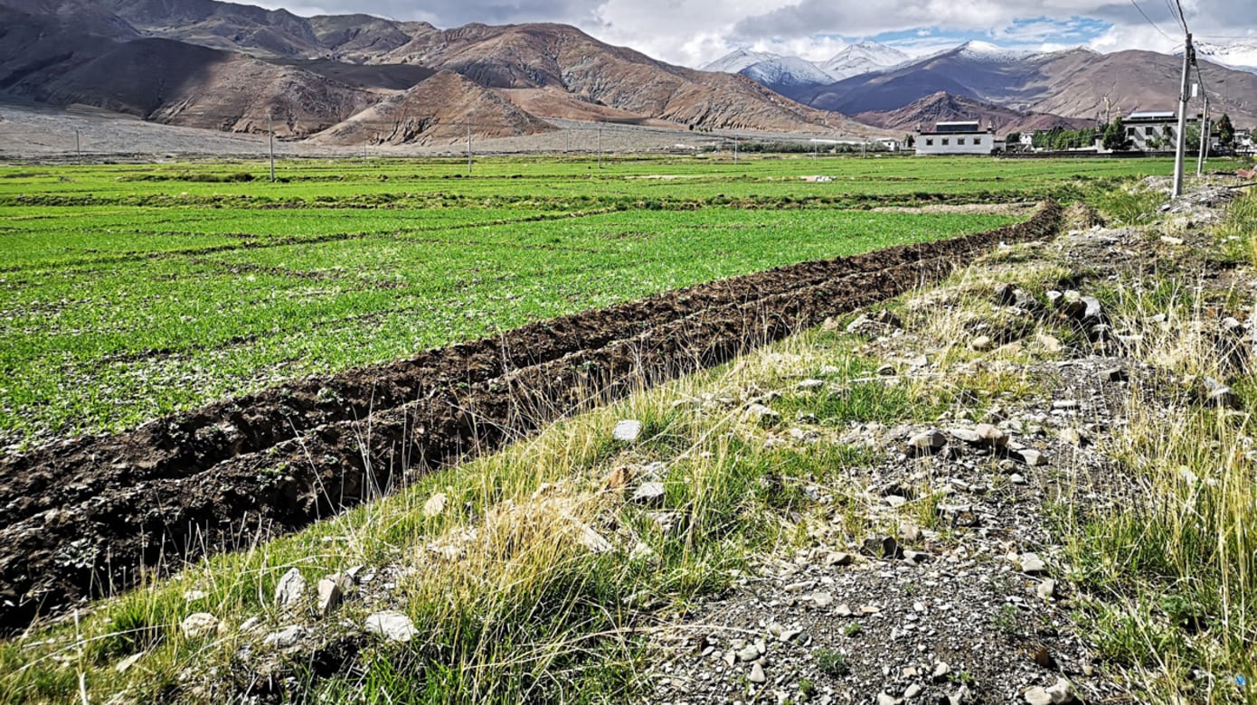 夏鲁寺外,今天依然是大片大片的青苗田,绿意铺展开来,一如千年前那支建寺的羽箭所落之地,仿佛时光从未远去。田野层层叠叠地向远方延伸,连绵起伏的褐色山脉,沉稳地环抱着村庄,雪山遥遥在望,洁白山巅与天上的浮云连成一片。