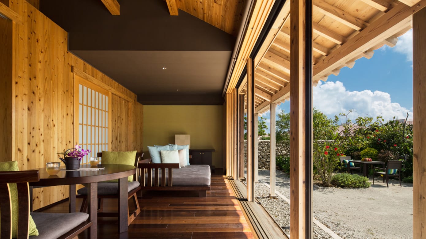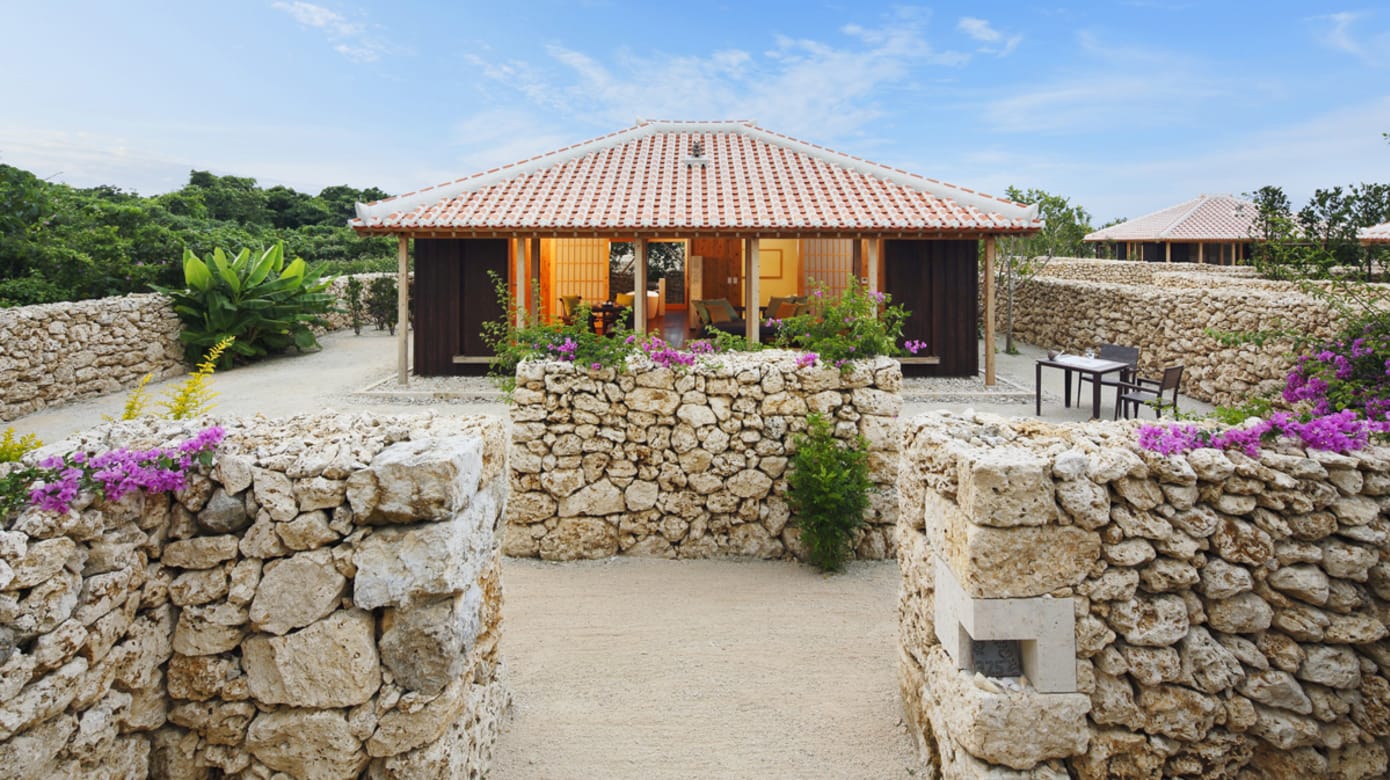 所有客房皆为独栋设计,仿照琉球传统民居建造:红瓦木屋、珊瑚沙庭、石灰岩墙,门前设有遮挡视线的屏风墙,屋后栽种防风的福木,每栋屋顶上都蹲着一尊神情各异的石狮守护神。
