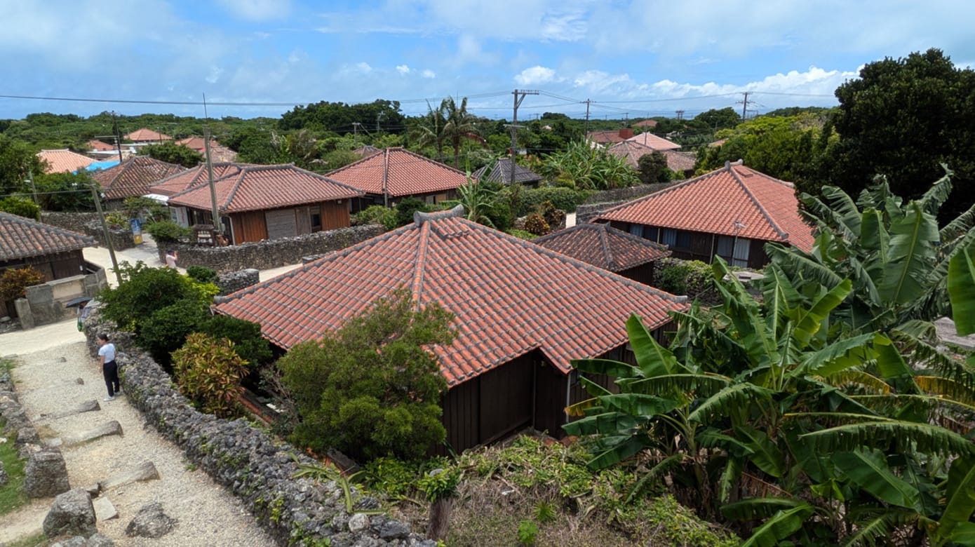 最主要的看点就是岛屿中心的传统村落,保留了早期琉球时代的样貌,被日本政府列为重要传统建筑物群保存地区。村里都是风格一致的岛民住宅,红瓦屋顶上坐着形态各异的石狮雕像,默默守护每户人家。全村没有高楼,最高处是赤山公园的展望塔,登高可俯瞰村落。