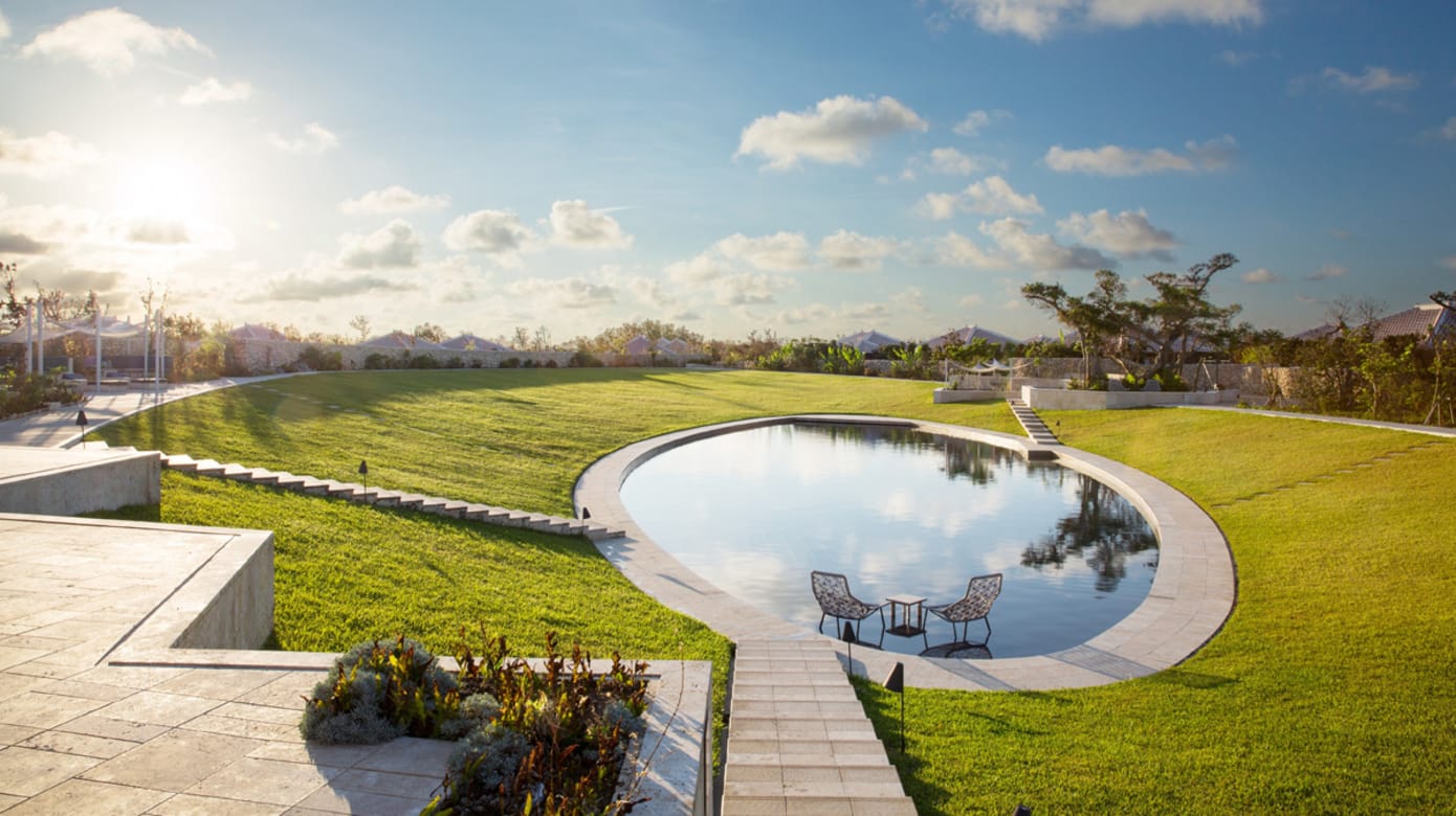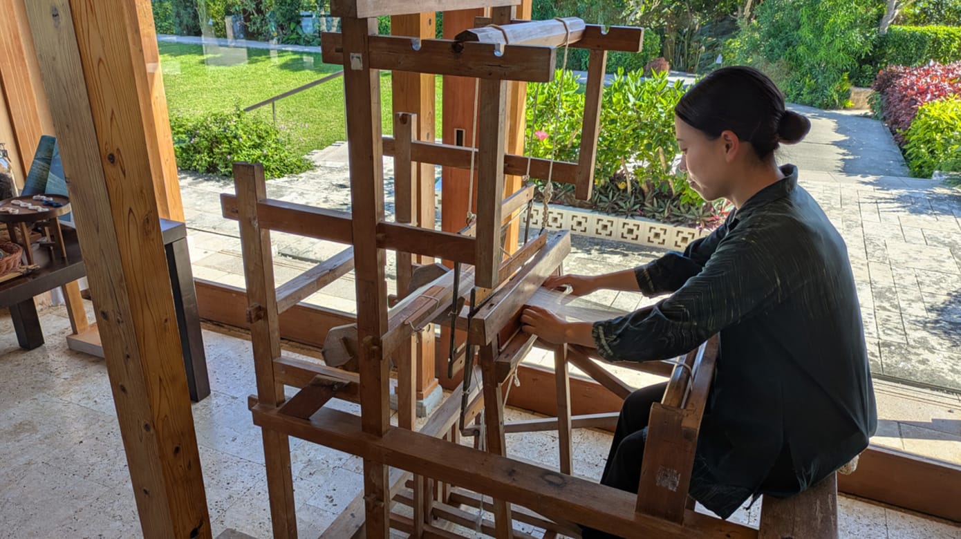 虹夕诺雅竹富岛强调琉球传统文化,椭圆形泳池是全村核心,周边草地上清晨和夜晚呼吸伸展活动。面向泳池的活动室,每天不同时段提供各种活动,如传统染织工艺、DIY香草茶、品尝特色小点、三线演奏等等,富有在地气息。