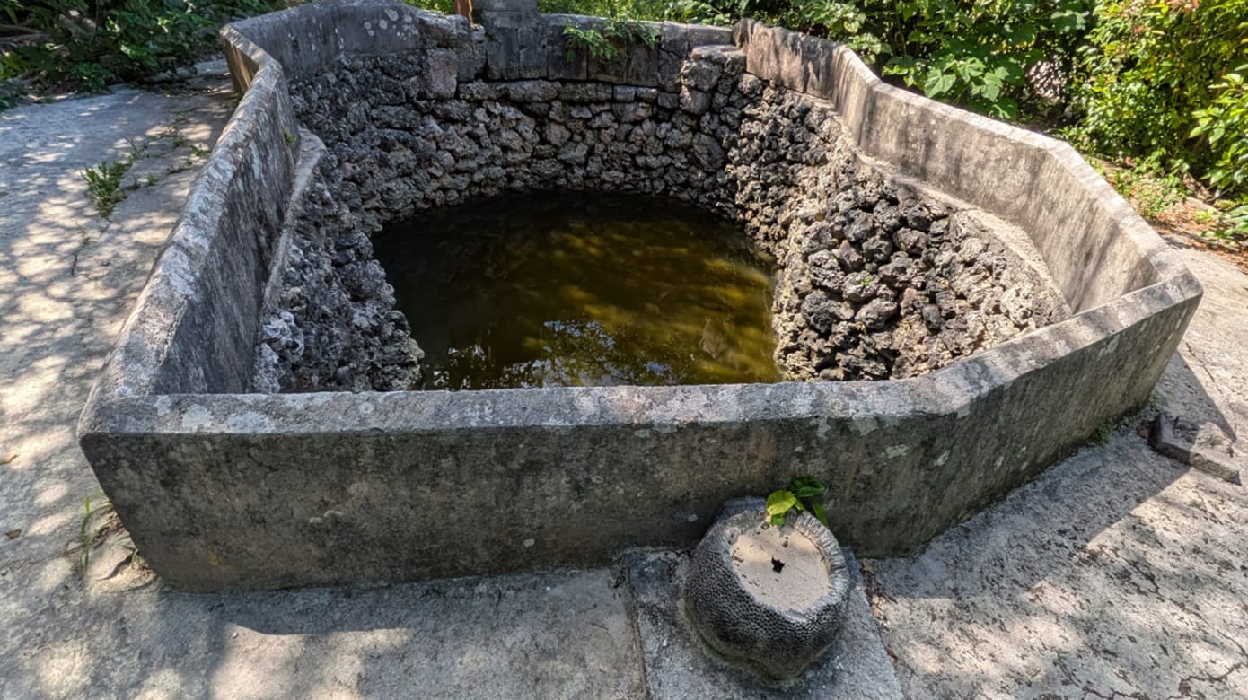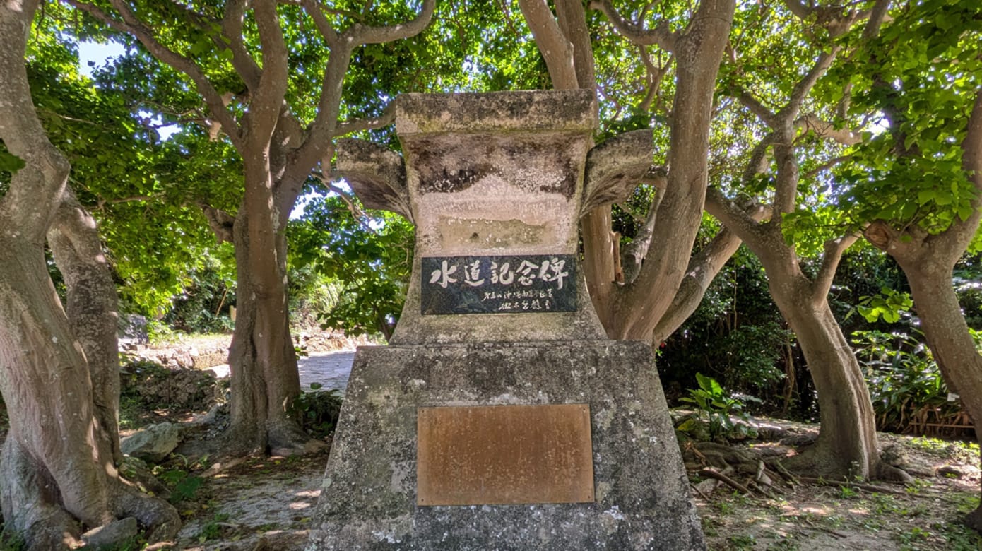 码头附近设有“Yugafu馆”游客中心,介绍岛上的自然风貌与文化背景。由此得知岛上生活大不易:竹富岛虽四面环海,却长期缺乏淡水,居民过去只能靠雨水和井水维生。直到1976年,才从邻岛铺设地下水管引水,储水于两个巨大水缸中。岛上因此流传着关于水的歌谣,也建有纪念碑纪念这段历史。看完展馆后,顺道前往水道纪念碑打卡,旁边有一座仲筋井,是引入外来水源之前,岛上最重要的净水来源。