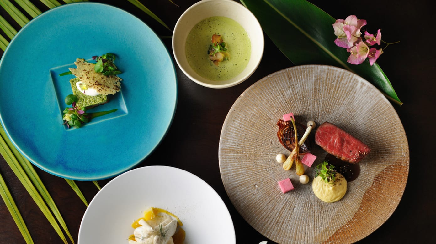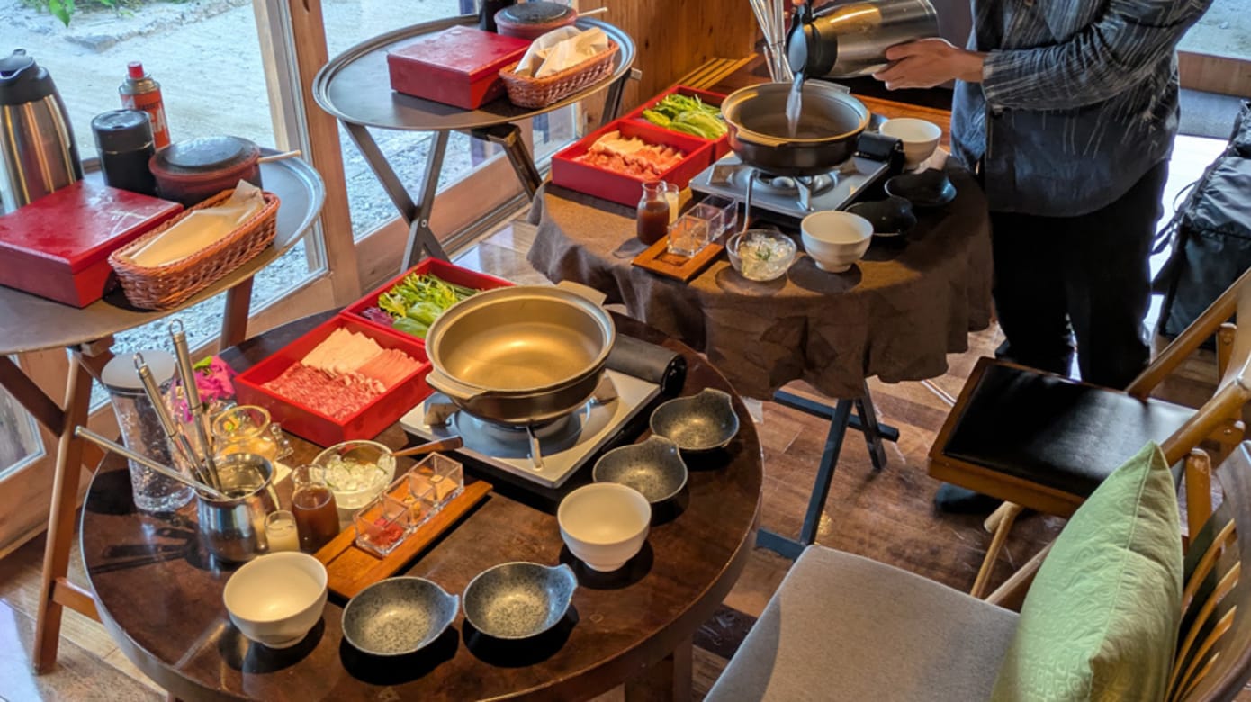 度假村里只有一间餐厅,重头戏是以八重山食材为主角的法式料理晚餐。没想到在这充满乡土气息的小岛上,竟能品尝高级法餐。主厨以Terroir(风土)为题,融合本地海鲜、香草与岛上特色食材,演绎出一场属于竹富岛的味觉探索。另一选择是在客房内享用风味火锅,工作人员把整套食材与用品送到房间里来,包括锅具、食材、蘸酱等等,风味岛锅以岛上野生香草为主,搭配缤纷海藻、鲜嫩肉类与在地蔬菜,特点是提供冰块,热气腾腾的肉品涮煮后放在冰块上凉吃,风味清爽,别具岛屿风情。