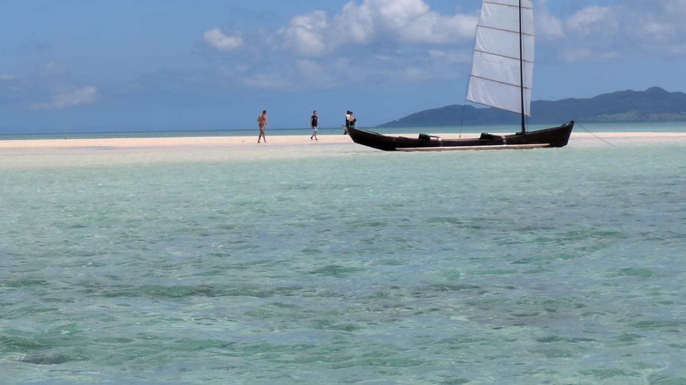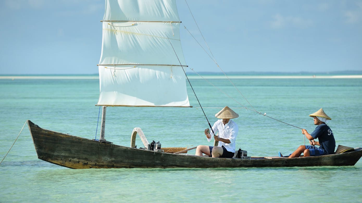 观光版的体验轻松许多,在透明如镜的海面轻轻漂浮,让人一窥昔日生活的缩影。船只最终停靠在Kondoi海滩外的沙洲,只在退潮时浮现的秘境,也被称为“幻之岛”(Phantom Island)。站上细白沙洲,环绕四周尽是湛蓝与碧绿交织的海水,低潮时还能一路涉水步行至岸边。波光粼粼中,蓝天大海仿佛溶为一体,恍惚间分不清自己是站在淼淼海中央,还是悠悠时光里。