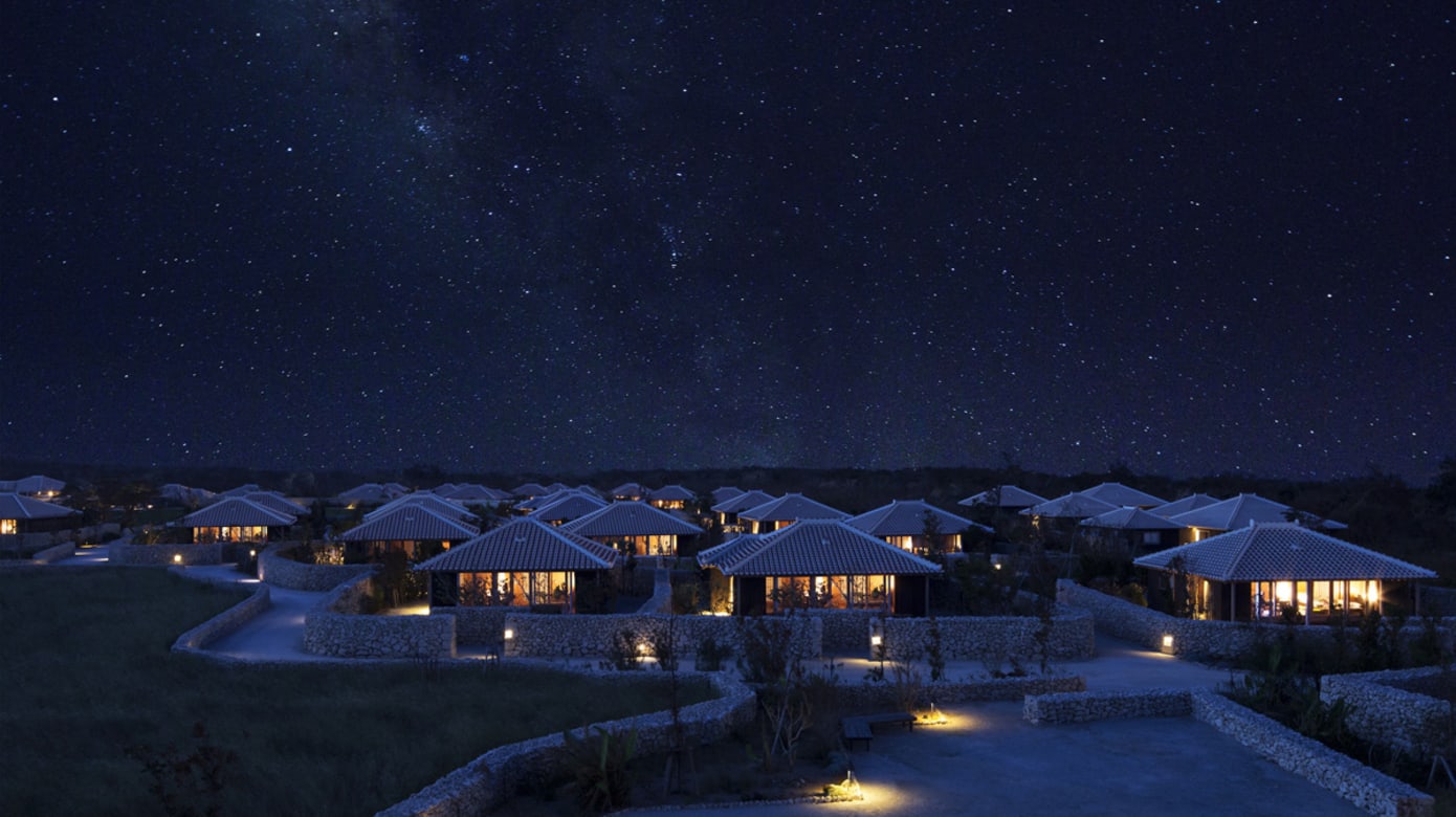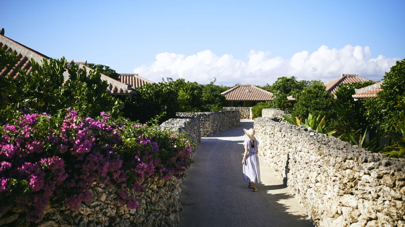 度假村里住所整齐排列,小路纵横,步行其间如穿梭在真实的琉球旧村中。靠海的小山丘上设有展望台,一侧俯瞰度假村全景,一侧则望向海边的茂密森林。沿着山丘后的小径穿出村落,可直达一片公共沙滩。