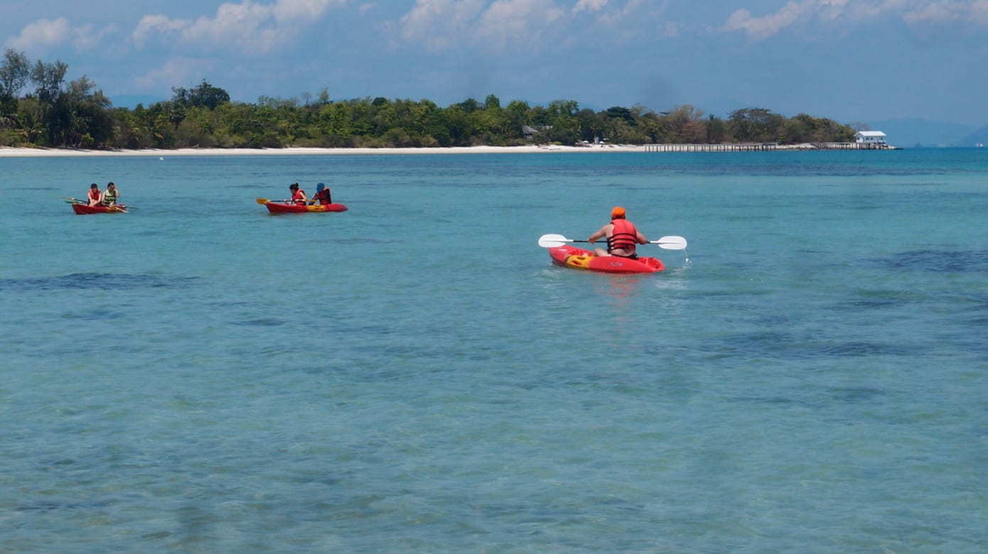 来到马德森岛(Koh Madsum)先别忙着登岛,可以安排长尾船先在岸外停留。这里的浮潜点水深只有2m左右,视线清晰,底下有珊瑚礁,水波晃动间鱼群清澈可见。玩够以后再继续上船,登岛上岸。狭长型的岛屿保留了原始自然风光,没有什么开发。细白沙滩上只有一家小店,在沙滩上搭起木屋,摆着几张凳子售卖饮料,也提供独木舟出租。这里风平浪静,适合初学者尝试和学习在海上划独木舟,或者点一杯饮料,享受沙滩上无所事事的放空。