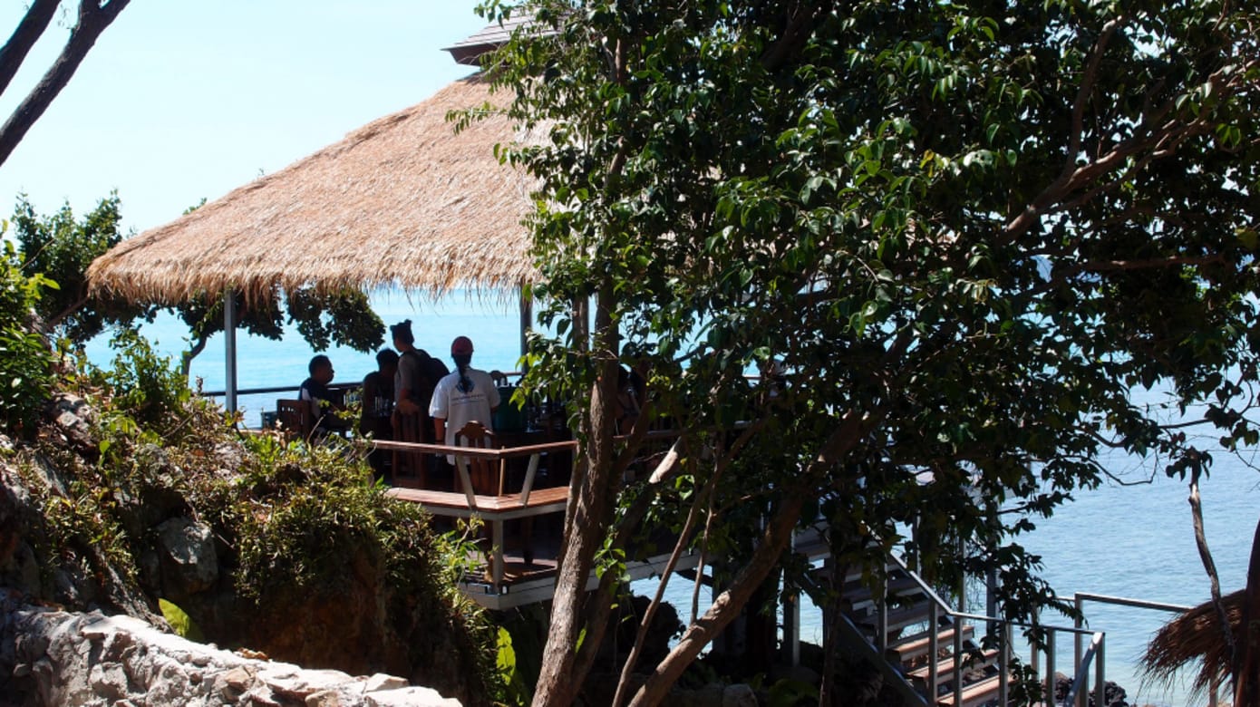 岛屿的另一端还有一间餐馆,可安排在这里享用午餐。由于食材都要从本岛运来,菜色与饮料选择极为有限。所谓的海景餐馆结构也非常简单,餐桌摆在海边的岩石上的平台上,炎热的午后伴着海风海景,感受热带岛屿风光。